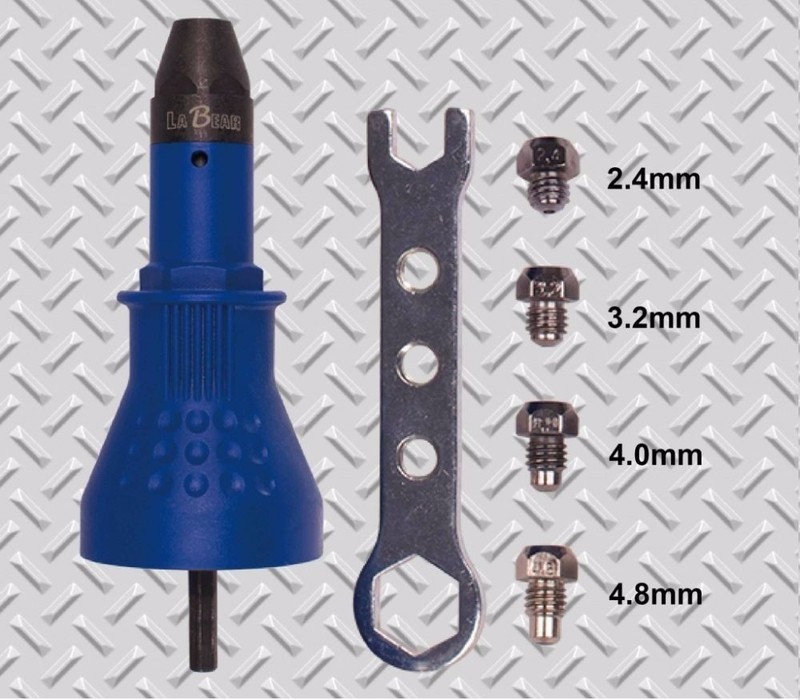 Đầu rút đinh tán gắn máy khoan có đầu cặp nhỏ nên lắp được hầu hết tất cả các loại máy khoan : nhưng khoan điện, khoan pin, hoặc thậm chí là cả khoan động lực.