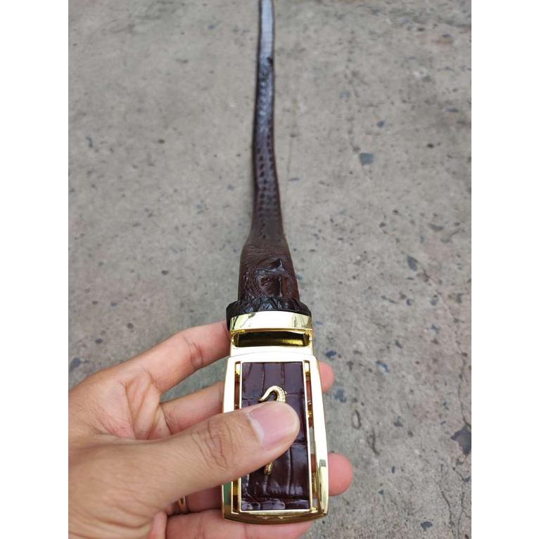 Thắt lưng da cá sấu nguyên con chạy từ gù cổ qua gai lưng đến vây đuôi của cá sấu. Mặt khóa tì tự động không rỉ sét.