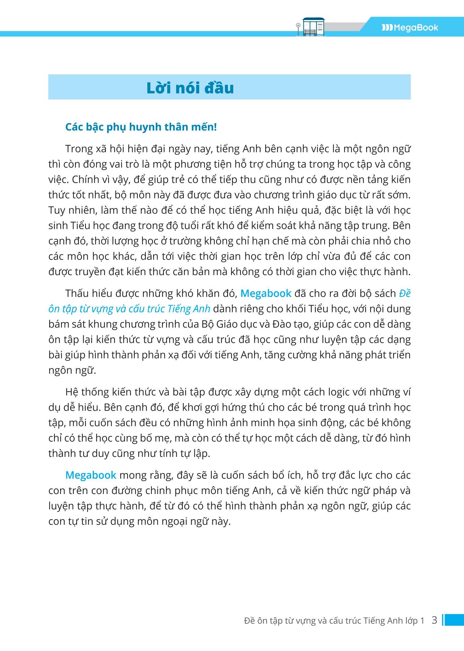 Megabook mong rằng, đây sẽ là cuốn sách bổ ích, hỗ trợ đắc lực cho các con trên con đường chinh phục môn tiếng Anh, cả về kiến thức ngữ pháp và luyện tập thực hành, để từ đó có thể hình thành phản xạ ngôn ngữ, giúp các con tự tin sử dụng môn ngoại ngữ này.