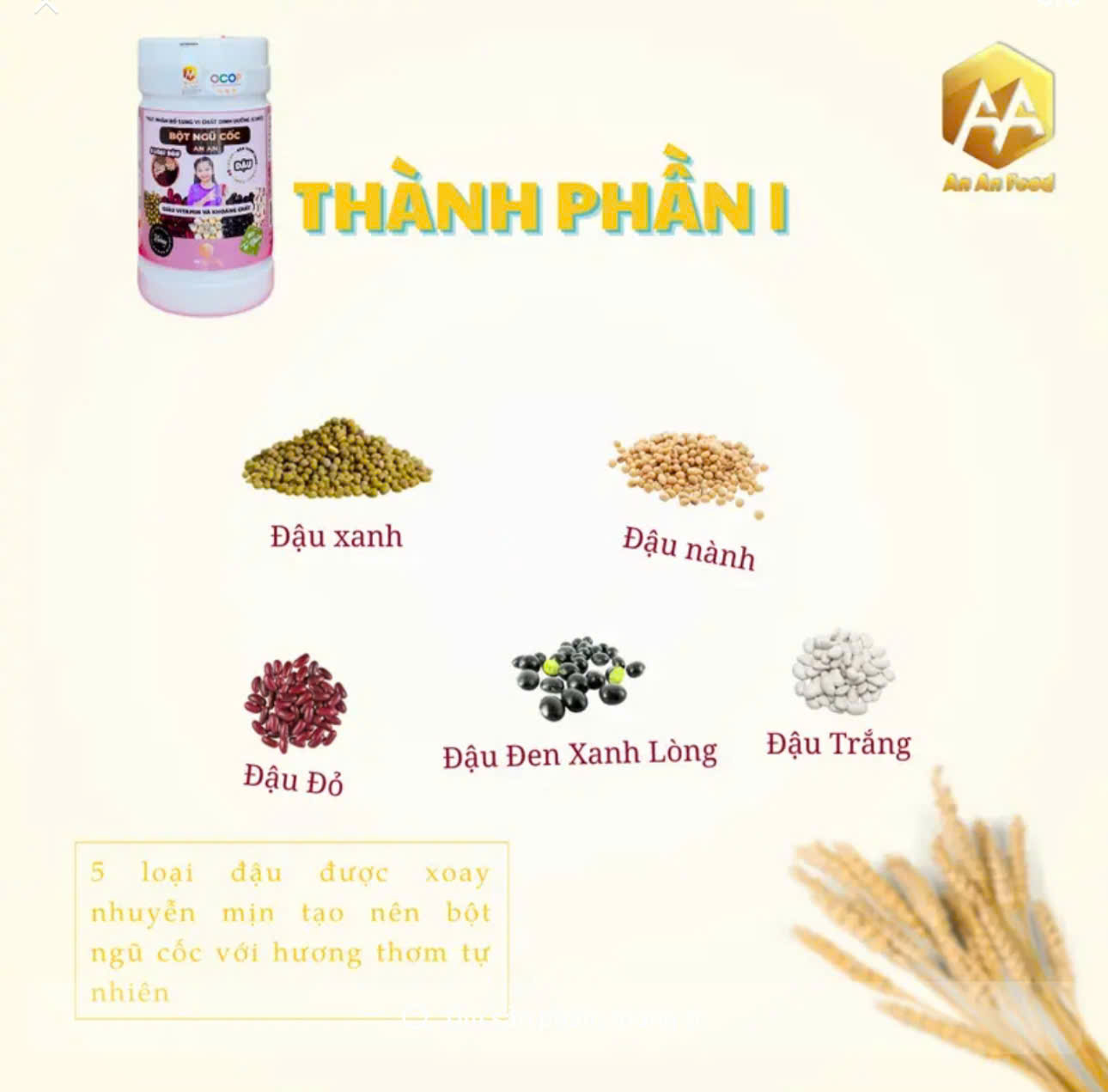 Thành Phần: Gạo lứt huyết rồng , Yến Mạch , Ngô , Đậu Xanh , lúa mạch , múa mỳ , canxi Công dụng : Trong ngũ Cốc có đường ISOMALT : Đây là loại