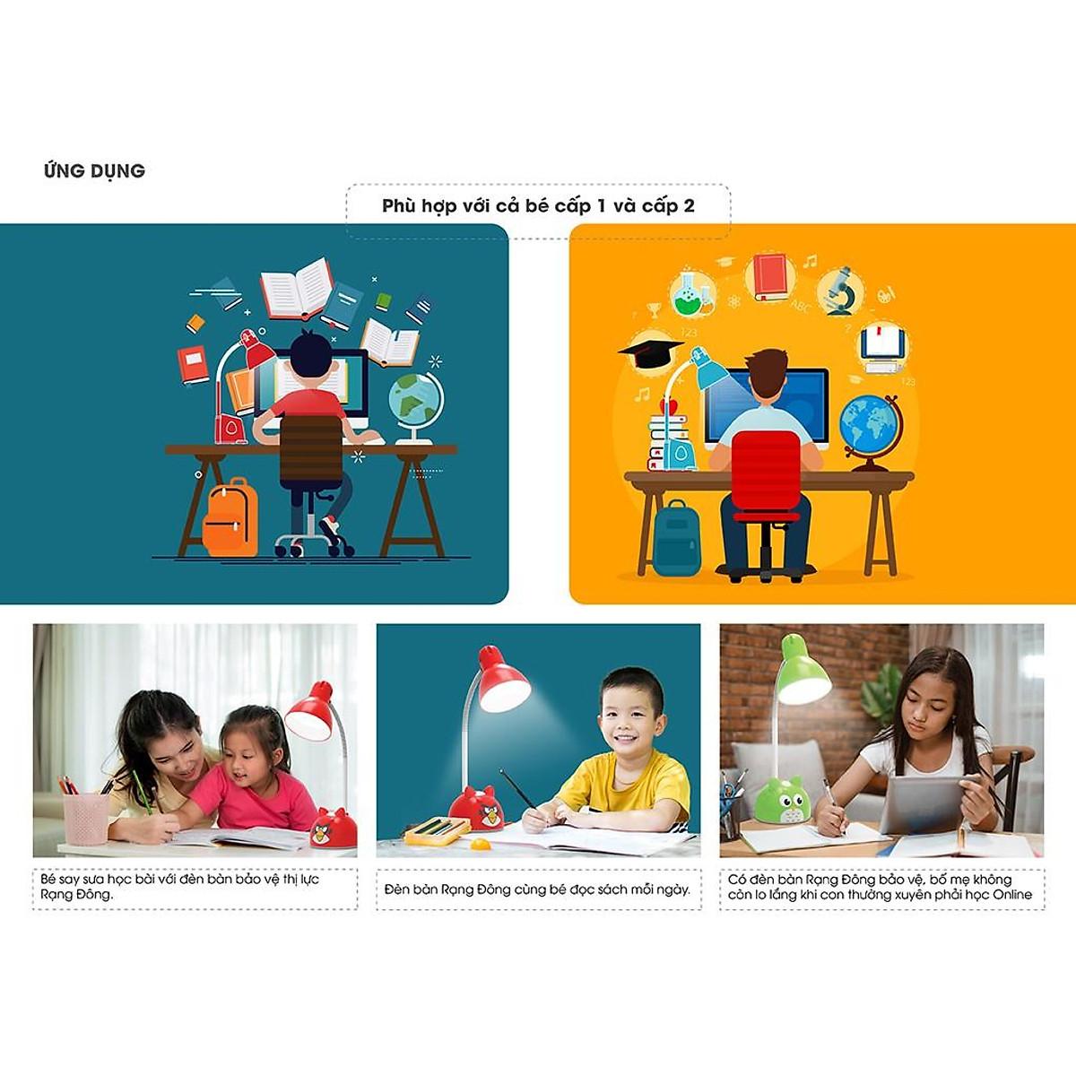 Đèn Bàn Rạng Đông Chống Cận LED 5W • Model: • Công suất: 5W/7W • Điện áp: 220V/50Hz • Nhiệt độ màu: 6500K (Trắng)/ Vàng(3000K)/ Đổi 3 màu ánh sáng • Màu đèn: Xanh/ Hồng