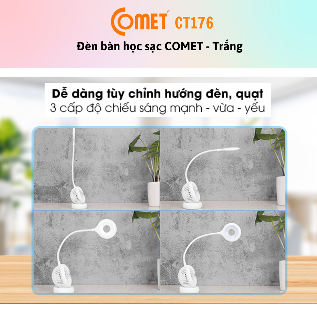 - Đèn Bàn + Đèn Sạc 2 Trong 1 LED COMET CT176 rất phù hợp để dành cho bé yêu nhà bạn, vừa học bài, vừa có quạt mát, mà không còn lệ thuộc vào việc nhà mất điện