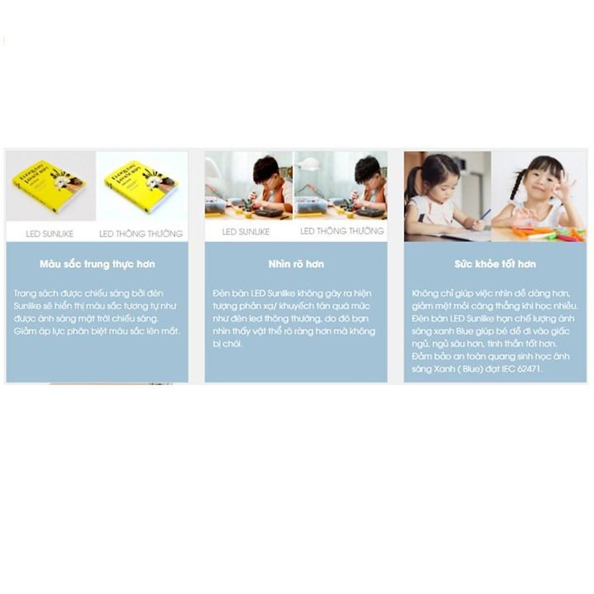 Đèn cắm điện trực tiếp, điện áp: 220V/50Hz Màu ánh sáng: Trắng/ Vàng Độ rọi trên mặt bàn: > 700 lux Ánh sáng liên tục không nhấp nháy, không gây mỏi mắt bảo vệ thị