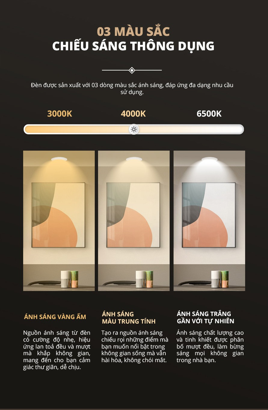 - Vàng ấm (3000K), Trung tính (4000K), Trắng giàu năng lượng (6500K).