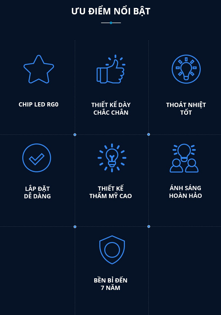 Sử dụng chip LED Samsung cho tuổi thọ cao trên 25.000 giờ sử dụng Vỏ chất liệu nhôm thuần được phủ lớp sơn nano cho màu sắc tương đồng với màu sắc hệ trần thạch