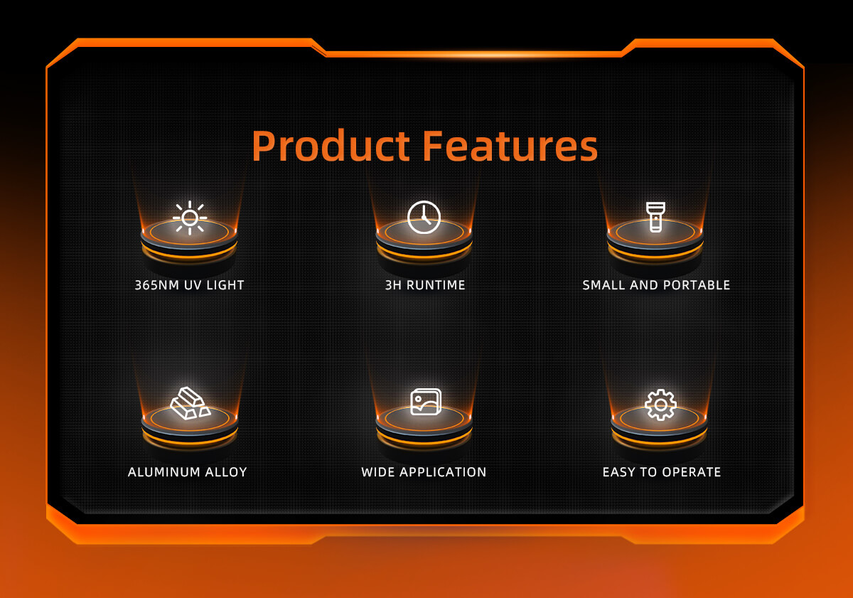 Đèn tia UV dùng cho công nghiệp Terino D60W-UV (395nm, 60W) - Hàng chính hãng Tính năng của đèn pin UV: Nguồn sáng lạnh, nhiệt độ bề mặt của vật thể được chiếu sáng tăng