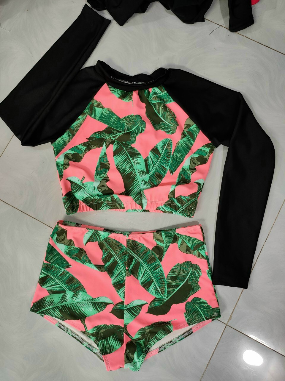 Set Đồ Bơi Nữ Rời Đùi Dài Tay Đi Biển Đi Bơi Chất liệu Polyester 95%, mật độ dệt vừa Áo có sẵn lớp đệm, hông áo có thể rút lên làm croptop cá tính