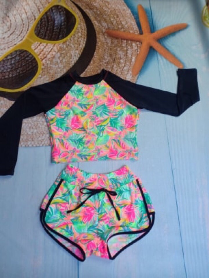 - Mẫu đồ bơi mới nhất cho các bạn nữ thích sự trẻ trung kín đáo mà vẫn thu hút khi đi biển, đi bơi. - Áo dáng ngắn tay phối hoạ tiết trẻ khoẻ,