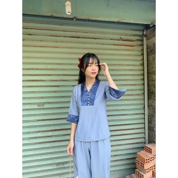 (Ảnh + Video shop tự quay) Bộ đồ lam đi chùa cổ tàu thêu sen gồm cả áo và quần, áo được thêu sen, quần có túi . Size: 24/26/28/30/32/34/36 ( tham khảo bảng chọn
