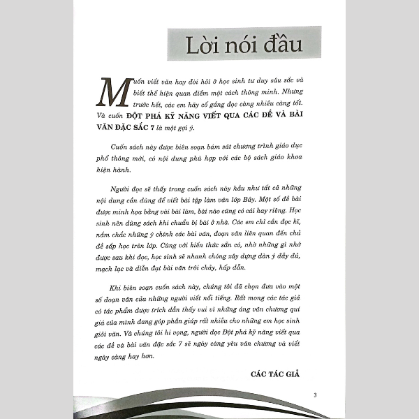Sách - đột phá kỹ năng viết qua các đề và bài văn đặc sắc 7 (dùng chung cho các bộ sgk hiện hành) . Không nên viết chung chung mà nên viết cụ thể; có thế thì bài văn mới hay, mới hấp dẫn, đọc lên nghe mới thú vị.Phải ngắm nhìn, quan sát, có lúc phải tưởng tượng, phải sắp xếp chi tiết, bộ phận của sự vật thì mới làm đựoc bài văn miêu tả đặc sắc, hay, được điểm cao.