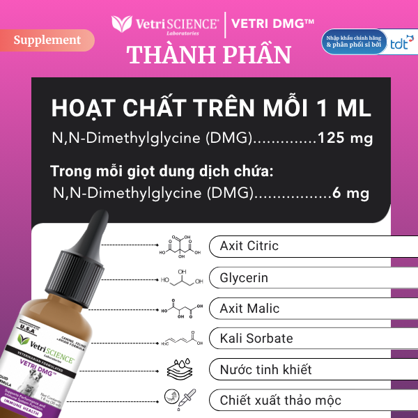 Sản phẩm được khuyến nghị sử dụng trong các trường hợp:   Tăng cường miễn dịch.   Hỗ trợ giải độc, thanh lọc cơ thể.   Tăng cường khả năng vận động và sức bền.   Cải thiện sức khỏe não bộ và hệ thần kinh.   Hỗ trợ giảm căng thẳng (stress) trên thú cưng.   DMG là một loại amino acid cần thiết để duy trì hoạt động bình thường của cơ thể. DMG đóng vai trò như một chất điều hòa miễn dịch giúp cải thiện khả năng tuần hoàn máu, tăng cường khả năng sử dụng oxy, cải thiện sức khỏe não bộ, gan, duy trì cấu trúc tế bào, hỗ trợ sức khỏe tim mạch, giảm căng thẳng (stress), chống oxy hóa, tăng cường miễn dịch và cân bằng, cải thiện các vai trò khác của cơ thể.   DMG còn giúp hỗ trợ cải thiện khả năng tuần hoàn và khả năng sử dụng oxy, tăng tốc độ hồi phục khối cơ, do đó thường được sử dụng trong các trường hợp vận động với cường độ cao (thi đấu, huấn luyện…). Thành phần này còn giúp hỗ trợ quá trình giải độc, giúp tăng cường sức khỏe tổng thể.   Sản phẩm Vetri DMG chứa thành phần chủ đạo là N,N-Dimethylglycine đóng vai trò như một adaptogen, mang lại hơn 40 lợi ích cho sức khỏe, đặc biệt giúp tăng cường miễn dịch và sức bền của thú cưng.   Sản phẩm không bổ sung hương liệu, không mùi và dễ dàng sử dụng, an toàn sử dụng cho nhiều đối tượng thú cưng ở mọi giống, kích thước và lứa tuổi.   Sản phẩm đạt chứng nhận SQF (Safe Quality Food) và chứng nhận FDA-Registered Facility, không chứa các hương liệu nhân tạo, không phẩm màu tổng hợp và không chứa chất bảo quản.   Xuất xứ: Mỹ.   Hướng dẫn sử dụng Sử dụng cho chó, mèo và nhiều loại thú cảnh khác.   Liều sử dụng cho chó mèo:   < 9kg thể trọng (20 lbs): 0.5 ml/cá thể.   9.5 - 18kg thể trọng (21 - 40 lbs): 1ml/cá thể.   18.5 - 36.3 kg thể trọng (41-80 lbs): 1.5 ml/cá thể.   36.7 - 45.4 kg thể trọng (81-100 lbs): 2ml/cá thể.   > 45.4kg thể trọng (>100 lbs): 3 ml/cá thể.   Cho uống 2 lần/ ngày với liều khuyến cáo sử dụng như trên trong vòng hai tuần. Sau đó 1 lần/ngày.   Liều sử dụng cho chim/gà:   1 giọt/100g thể trọng/ngày. Sản phẩm này là tài sản cá nhân được bán bởi Nhà Bán Hàng Cá Nhân và không thuộc đối tượng phải chịu thuế GTGT. Do đó hoá đơn VAT không được cung cấp trong trường hợp này.