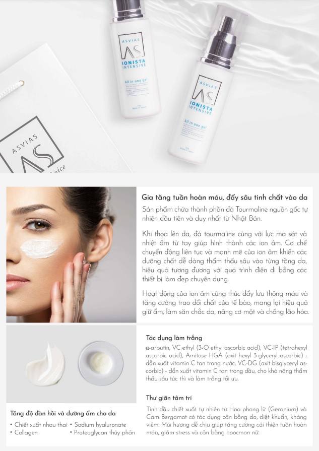 5. Mặt nạ khóa ẩm. Năm chức năng được chứa trong một sản phẩm tạo nên sự tối ưu thời gian chăm sóc da, tiện lợi cho việc sử dụng. Với tất cả các chức năng cung cấp những nhu cầu thiết yếu cho da - ASVIAS IONISTA INTENSIVE sẽ mang lại cho người sử dụng một trải nghiệm tiện ích và hiệu quả tối đa nhất. ****Hướng dẫn sử dụng: Sáng - Tối Bước 1: Sau khi rửa mặt vào buổi sáng và tối, lấy 1 lượng gel thích hợp ra tay, hít thở thật chậm và thật sâu để cảm nhận mùi hương nhằm kích thích lưu thông máu. Bước 2: Sau đó, chấm gel lên trán, mũi, má, cằm rồi thoa nhẹ nhàng lên toàn bộ khuôn mặt theo hướng từ trong ra ngoài. Bước 3: Dùng hai lòng bàn tay nhẹ nhàng áp và giữ yên 3-4 giây trên da để các tinh chất được thẩm thấu tối đa vào da.