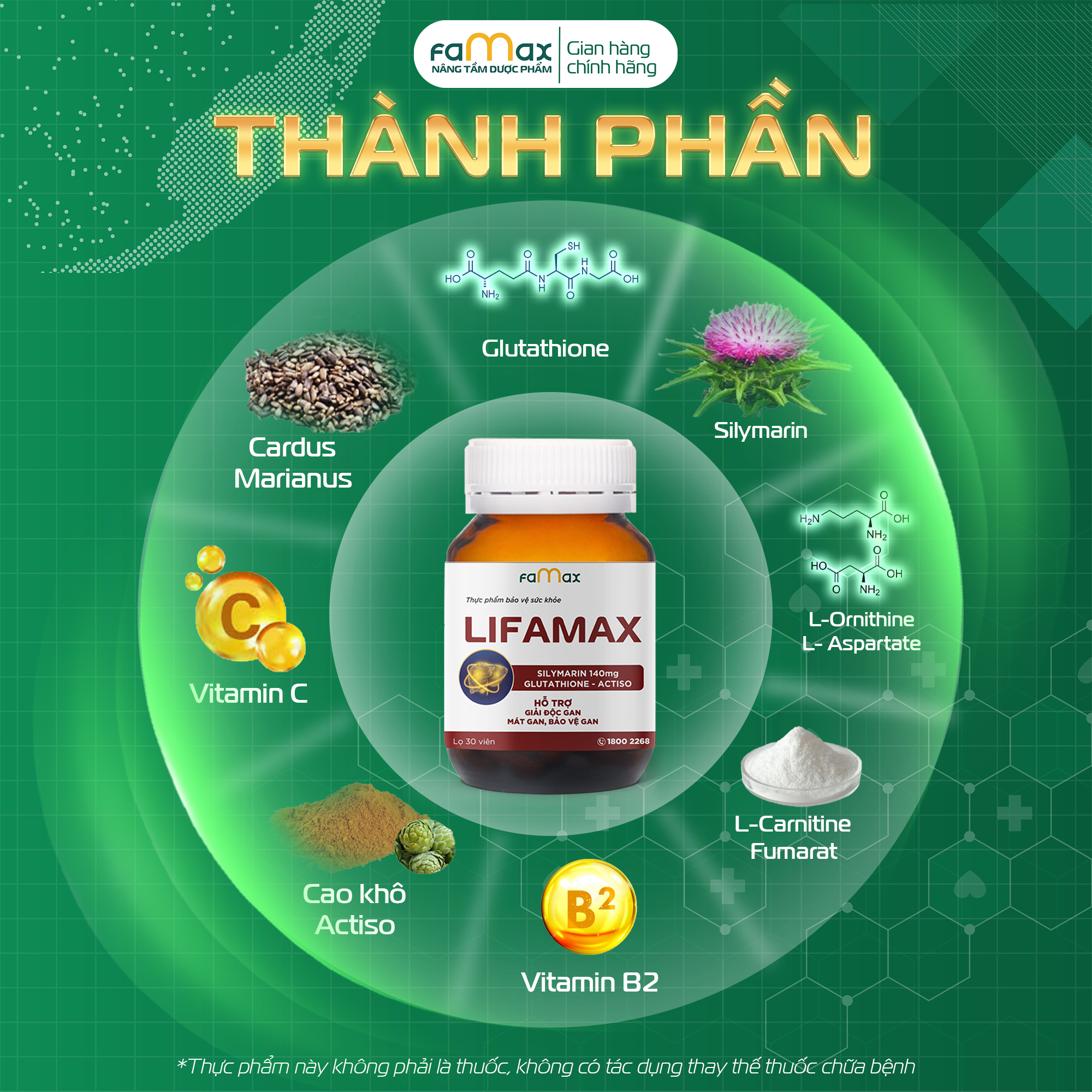 THỰC PHẨM BẢO VỆ SỨC KHỎE LIFAMAX Thành phần Trong 1 viên chứa: Glutathione…………………………………………………………………………… 150mg Silymarin……………………………………………………………………………….. 140mg (Cardus marianus extract 280mg) Cao khô Actiso (Cynara scolymus)…………………………………… 50mg (tương đương 2000 mg thảo mộc khô) L-Ornithine L- Aspartate……………………………………………………… 30mg L-Carnitine fumarat……………………………………………………………….. 10mg Vitamin C (Acid Ascorbic)……………………………………………………. 10mg Vitamin B2 (Riboflavin)………………………………………………………….. 2mg Phụ liệu: Chất độn (Lactose), chất ổn định (polyvinyl pyrrolidone (PVP K30)), chất bảo quản (nipagin, nipasol), chất chống đông vón (Magnesium stearate), vỏ nang (gelatin).