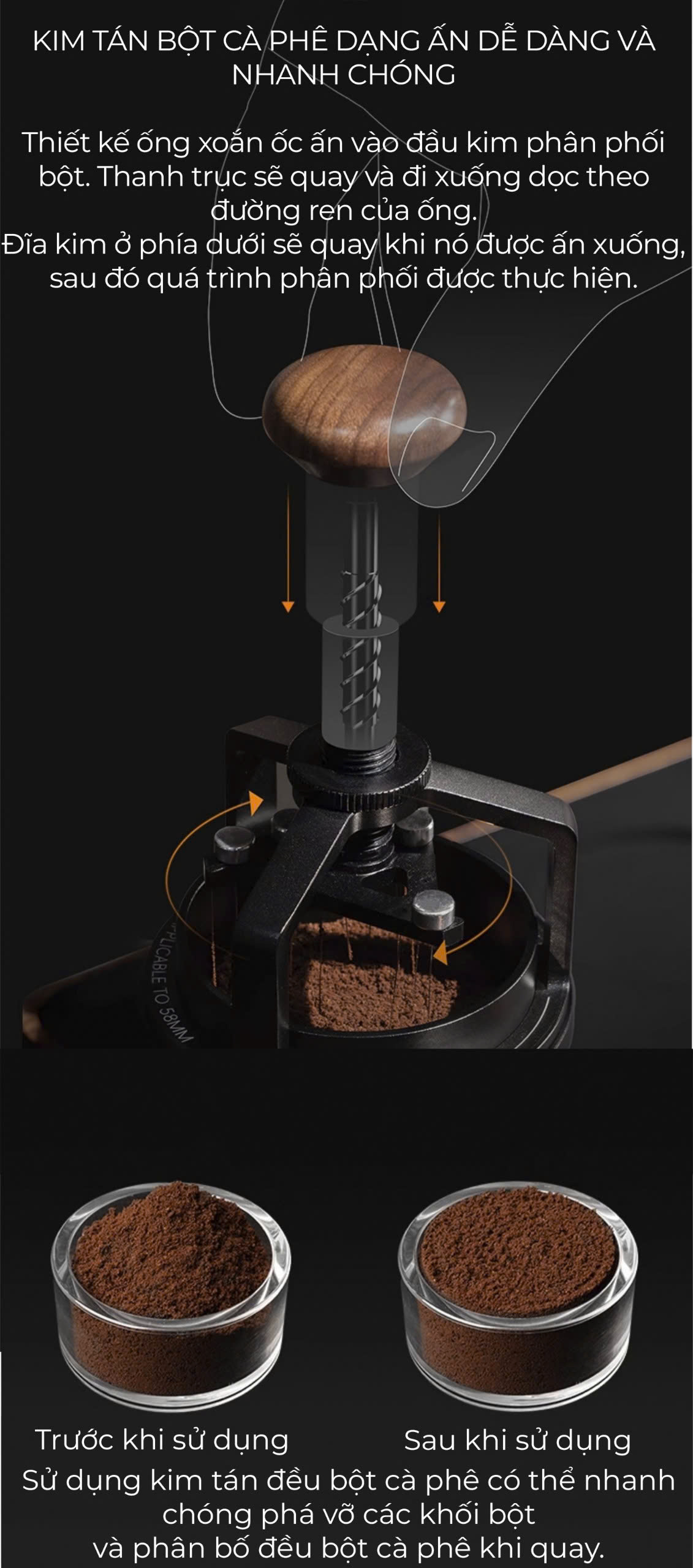 Việc sử dụng kim tán bột giúp giảm hiện tượng kênh nước (channeling), tăng cường độ đồng nhất của bột cà phê, từ đó tạo ra một ly espresso có hương vị đậm đà, cân bằng và trọn vẹn hơn.