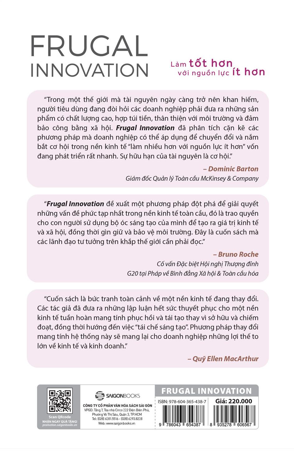Cuốn sách Frugal Innovation – Làm Tốt Hơn Với Nguồn Lực Ít Hơn cung cấp những chỉ dẫn cần thiết để doanh nghiệp tiếp cận phương pháp đổi mới sáng tạo tiết kiệm đúng cách. Khi mà sự trỗi dậy của chủ nghĩa tiêu dùng từng xảy ra trong thế kỷ 20 nay không còn nữa. Cách sống cần kiệm, khát vọng, tính cá nhân hóa và những giới hạn của tự nhiên đều đòi hỏi chúng ta thì Frugal Innovation: How to do better with less lại ra đời đúng thời điểm. Tác giả Radjou và Prabhu đã vẽ ra một bức tranh sống động về cách thức doanh nghiệp có thể pha trộn các giá trị và chất lượng để mang lại sự cân bằng cá nhân và xã hội mà những người tiêu dùng của thế kỷ 21 mong muốn.