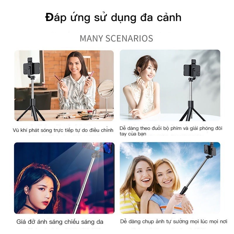 Gậy chụp ảnh quay video 3 chân có đèn led trợ sáng Gậy tự sướng selfie chụp hình bluetooth điều khiển từ xa xoay nhiều góc độ loại tốt Đặc điểm nổi bật: - Chụp ảnh bluetooth đến 10 mét - Gậy chụp ảnh 3 chân tripod tiện lợi - Xoay điện thoại ngang dọc linh hoạt - Gấp gọn, co dãn điều chỉnh điện thoại thông minh - Phù hợp nhiều loại điện thoại hiện nay Lưu ý : Bên shop có 2 phân loại gồm : Gậy có đèn và Gậy không đèn ( Qúy khách đặt hàng chú ý chọn đúng phân loại cần mua ạ ) Chi tiết sản phẩm: 1. Loại có đèn led trợ sáng (bản nâng cấp): - Có điều khiển blueetooth, có xoay được điện thoại ngang, dọc, gập lên gập xuống - Có đèn led trợ sáng sạc điện (đã kèm sạc USB) - Với ưu điểm có đèn sẽ giúp bạn tăng sáng cho bức ảnh hoặc video bạn quay có độ sáng hơn và đẹp hơn hẳn - Màu sắc: Đen - Chất liệu: nhựa ABS+ inox - Pin: Cr1632 - Kích thước: chiều dài tối đa đạt 100cm - Điều khiển: sử dụng remote Bluetooth điều khiển từ xa khoảng cách lên đến 10 mét    2. Loại thường (không có đèn trợ sáng): - Có điều khiển blueetooth, có xoay được điện thoại ngang, dọc, chốt vặn gập lên xuống - Màu sắc: Đen - Chất liệu: nhựa ABS+ inox - Pin: Cr1632 - Kích thước: chiều dài tối đa đạt 100cm - Điều khiển: sử dụng remote Bluetooth điều khiển từ xa khoảng cách lên đến 10 mét    4. Gậy chụp ảnh XT-02 - Mã : XT02 - Có điều khiển blueetooth, có xoay được điện thoại ngang, dọc, gập lên gập xuống - Chất liệu: nhựa ABS+ inox - Màu sắc: Đen - Pin: Cr1632 - Kích thước: chiều dài tối đa đạt 80cm