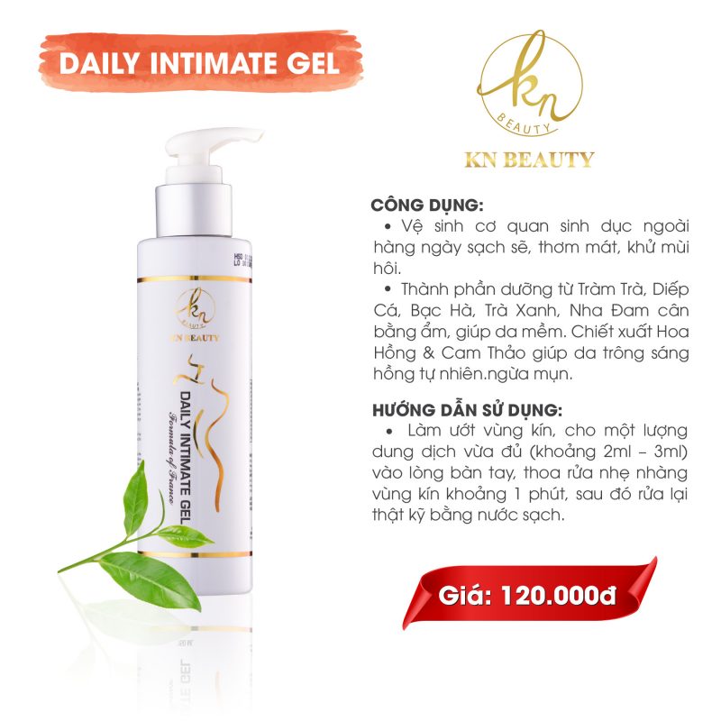 GEL VỆ SINH PHỤ NỮ HÀNG NGÀY KN BEAUTY Gel vệ sinh nữ hàng ngày KN Beauty DAILY INTIMATE GEL được bào chế theo Công thức độc quyền CỦA PHÁP với thành phản dưỡng có nguồn gốc thiên nhiên giúp vùng kín được làm sạch dịu nhẹ, an toàn và hiệu quả. Chăm sóc nâng niu làn da mong manh nhạy cảm luôn mềm mại, mịn màng và sáng hồng tự nhiên. Thành phần Gel vệ sinh phụ nữ hàng ngày KN Beauty Chiết xuất từ các loại thảo dược quý phối hợp chăm dưỡng và bảo vệ tối ưu nhờ bởi các hoạt tính đặc biệt vốn có tự nhiên trong thành phần dưỡng chất.