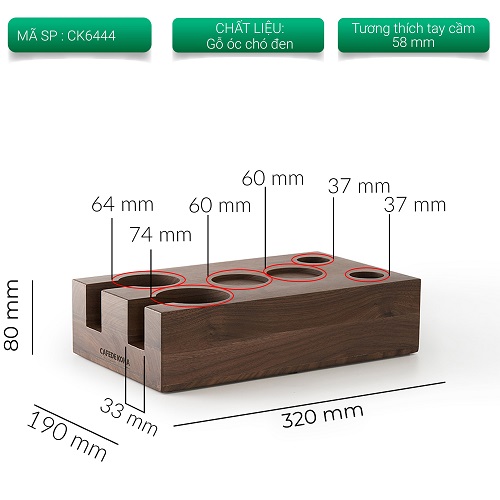 GIÁ ĐỠ TAMPER BẰNG GỖ TỰ NHIÊN PHA CÀ PHÊ MÁY ESPRESSO CAFE DE KONA Khối gỗ được làm bằng 2 loại gỗ: gỗ óc chó đen và gỗ giẻ gai châu âu. Với thiết kế khe tròn cố định tay cầm máy pha. Đảm bảo quá trình nén bột cà phê sẽ vững chắc, giảm rung lắc. 2 khe tròn kế bên là nơi đặt tamper nén cũng như OCD, giúp barista dễ dàng thao tác hơn trong quá trình pha chế. Chất liệu gỗ tự nhiên, đảm bảo an toàn khi sử dụng. Vân gỗ độc đáo, rất đẹp mắt. Phần đế với bốn miếng đệm bằng nhựa chống trượt và chống trầy xước cho mặt bàn. Khối gỗ bo tròn 4 cạnh, được xử lý vec ni bề mặt rất mịn, tạo cảm giác cầm nắm tuyệt vời.