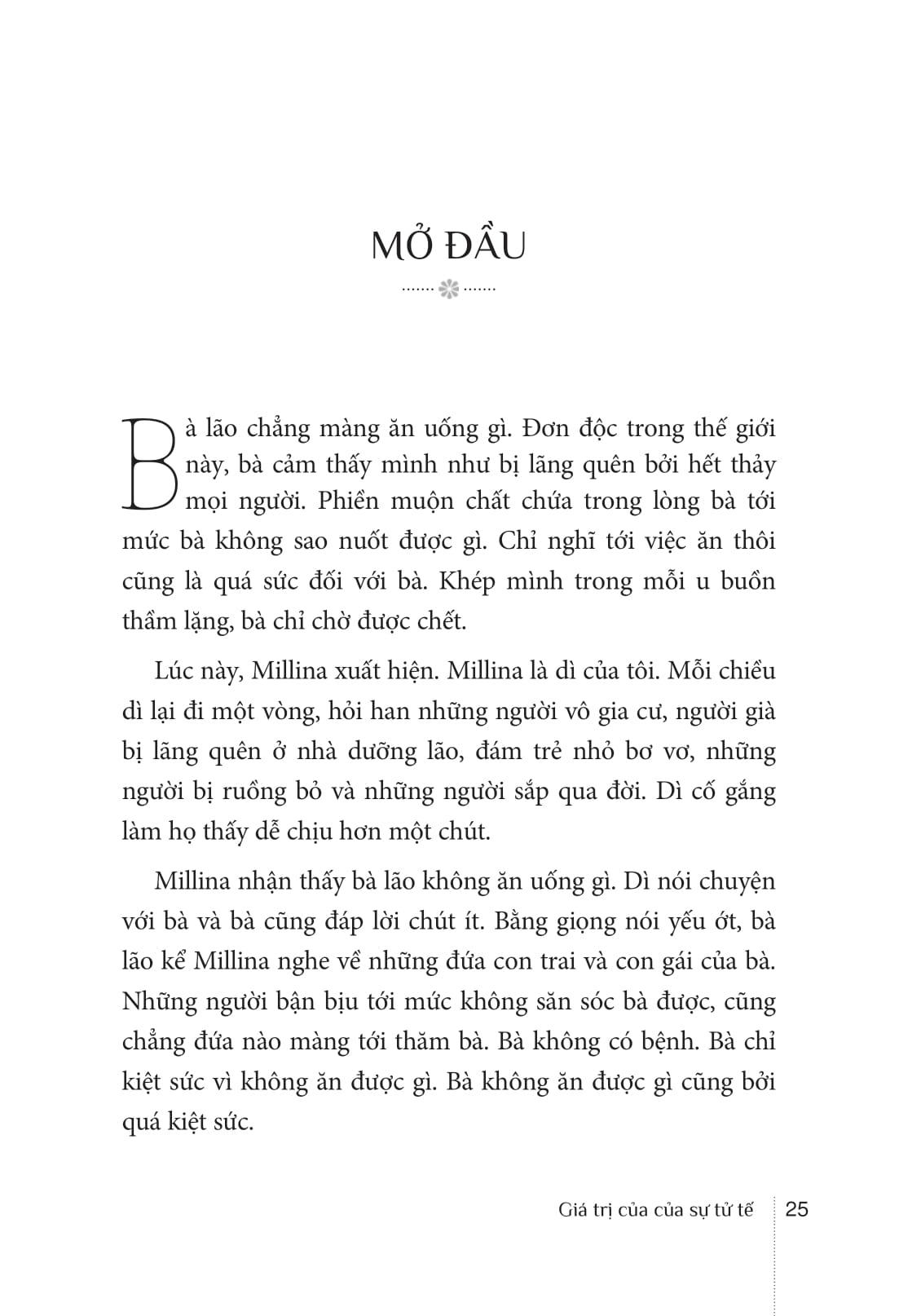 Giá Trị Của Sự Tử Tế Lòng tốt và sự đồng cảm là hai trong số nhiều điều thiết yếu khiến cuộc sống của chúng ta có ý nghĩa. Chúng là khởi nguồn cho hạnh phúc và niềm vui vĩnh cửu. Chúng là nền tảng của một trái tim nồng ấm, trái tim của người sẵn lòng dang tay giúp đỡ người khác một cách vô tư. Bằng lòng tốt, tình thương yêu, sự trung thực, chân thành và công bằng với tất cả mọi người, ta có thể bảo vệ sự tử tế. Đó là lẽ thường tình. Quan tâm tới mọi người là một việc đáng làm, bởi vì hạnh phúc của chúng ta gắn liền với hạnh phúc của những người khác. Nếu xã hội chìm trong đau khổ, bản thân chúng ta cũng đau khổ. Khi trái tim và tâm trí ta càng bị cái ác lấn át, ta càng trở nên bất hạnh. Bởi vậy, lòng tốt và sự đồng cảm là những giá trị ta không thể thiếu được. Việc cố gắng tạo ra điều gì đó tích cực trong cuộc sống là điều vô cùng quan trọng. Chúng ta không được sinh ra để gây rắc rối và làm hại người khác. Như Piero Ferrucci đã trình bày một cách đầy đủ và mạch lạc trong cuốn sách Giá trị của sự tử tế này, để cuộc sống thật sự có giá trị, ta cần củng cố và nuôi dưỡng những giá trị cơ bản của con người như sự nhiệt thành, lòng tốt và sự đồng cảm. Nếu làm được điều đó, cuộc sống của chúng ta sẽ trở nên có ý nghĩa, hạnh phúc và bình an hơn, đồng thời sẽ góp một phần tích cực vào thế giới quanh m.ình.