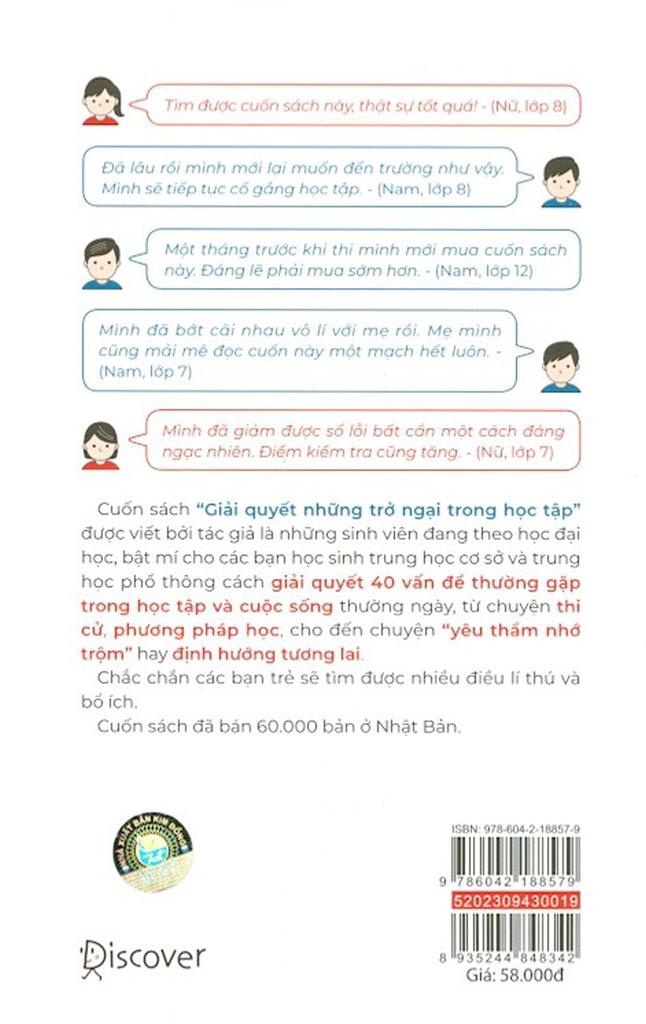 - Mình đã giảm được số lỗi bất cẩn một cách đáng ngạc nhiên. Điểm kiểm tra cũng tăng. - (Nữ, lớp 7) Cuốn sách “Giải quyết những trở ngại trong học tập” được viết bởi tác giả là những sinh viên đang theo học đại học, bật mí cho các bạn học sinh trung học cơ sở và trung học phổ thông cách giải quyết 40 vấn đề thường gặp trong học tập và cuộc sống thường ngày, từ chuyện thi cử, phương pháp học, cho đến chuyện “yêu thầm nhớ trộm” hay định hướng tương lai. Chắc chắn các bạn trẻ sẽ tìm được nhiều điều lí thú và bổ ích. Cuốn sách đã bán 60.000 bản ở Nhật Bản. SAU KHI ĐỌC XONG CUỐN SÁCH, CÁC BẠN SẼ THAY ĐỔI THẾ NÀO???