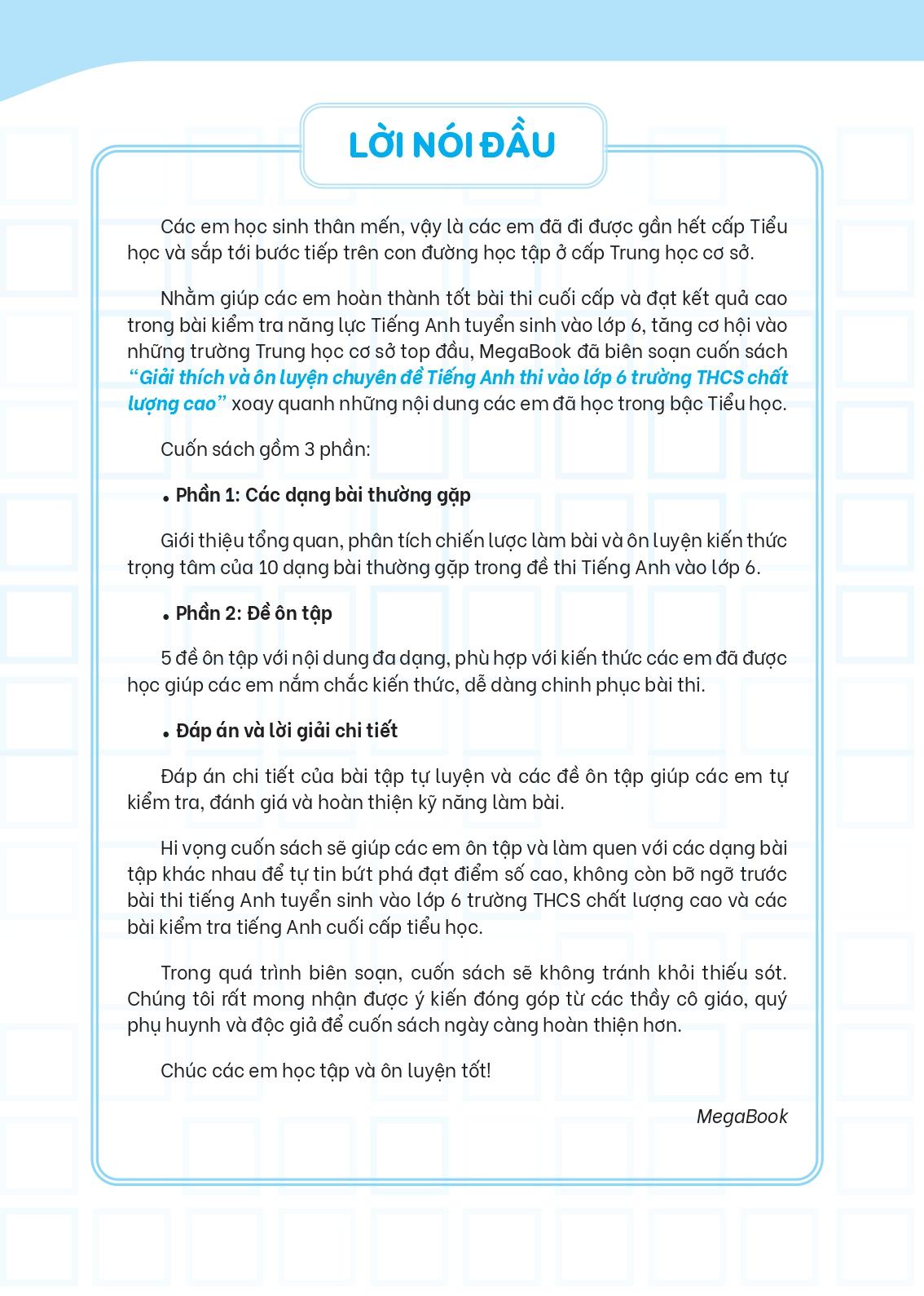 “Giải thích và ôn luyện chuyên đề Tiếng Anh thi vào lớp 6 trường THCS chất lượng cao” gồm những nội dung các em đã học trong bậc Tiểu học, giúp các em hoàn thành tốt bài thi cuối cấp và đạt kết quả cao trong bài kiểm tra năng lực Tiếng Anh tuyển sinh vào lớp 6, tăng cơ hội vào những trường Trung học cơ sở top đầu ƯU ĐIỂM NỔI BẬT CỦA CUỐN SÁCH
