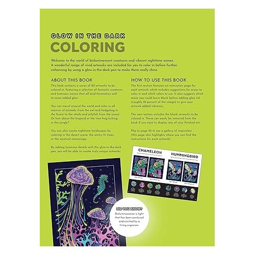 Create your own bioluminescent animal and nature scenes in this coloring book that includes a special glow-in-the-dark pen. These scenes of animals, flowers, and landscapes are gorgeous in daylight and at nighttime. As you color in the pages, use the included glow-in-the-dark pen to highlight features such as eyes and patterns, or to add an outline to the hummingbird, chameleon, butterfly, or others. Glow in the Dark Coloring also provides instructions on coloring techniques, how to apply the glow details, and fascinating facts about bioluminescent animals. Each of the 20 detailed illustrations in this book features a dark background, giving the finished scenes a wonderful nighttime look.