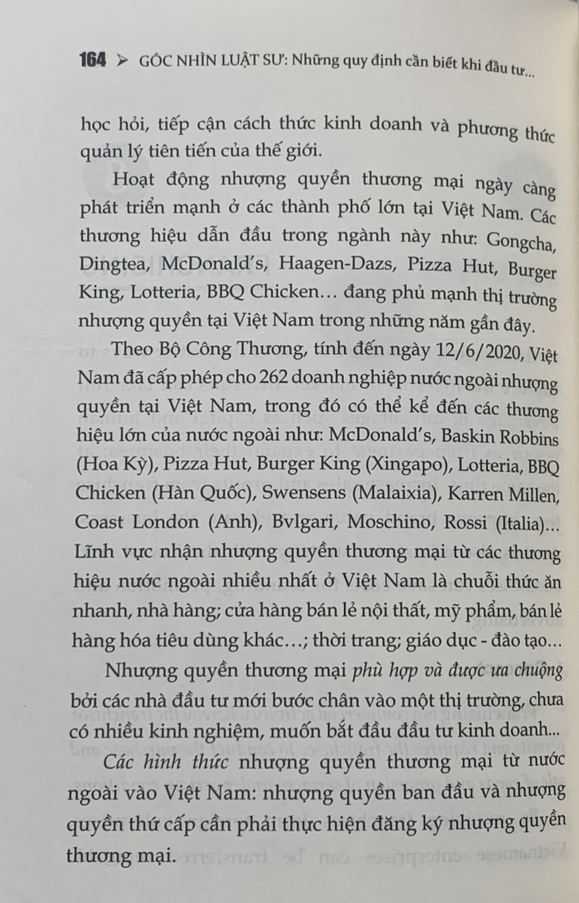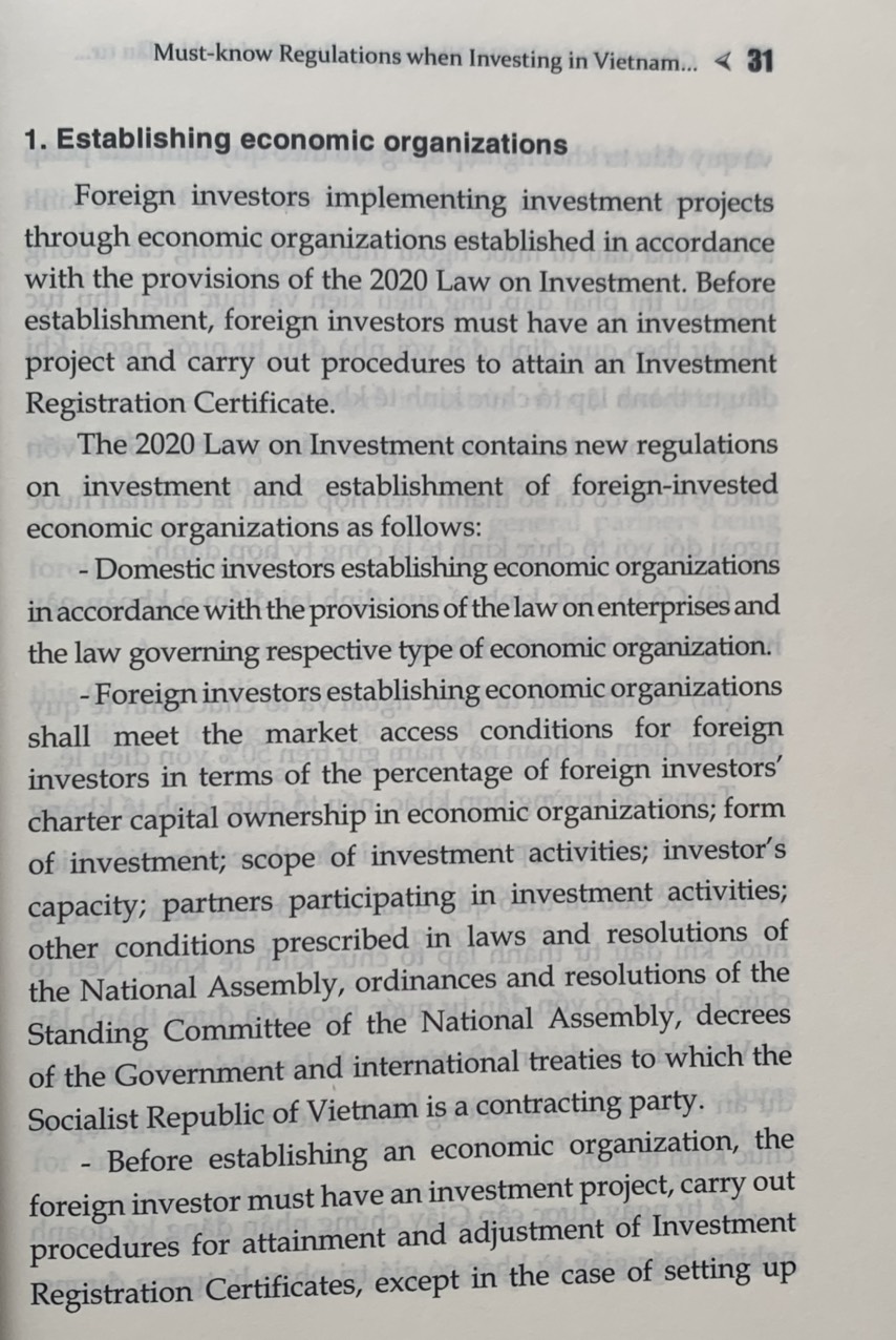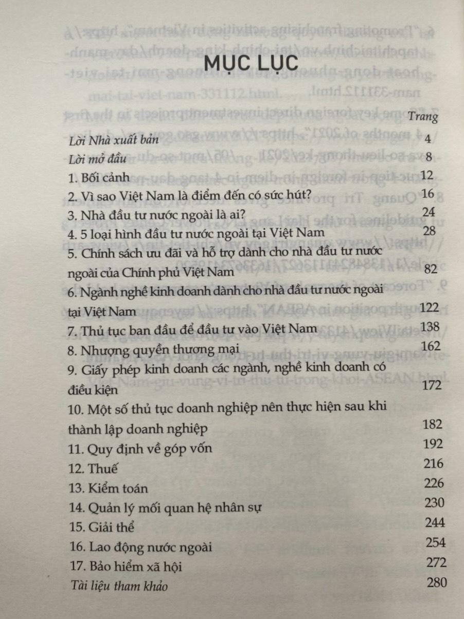 GÓC NHÌN LUẬT SƯ (song ngữ) Những quy định cần biết khi đầu tư vào Việt Nam ThS. Luật sư Lê Thị Dung Nxb Chính trị Quốc gia Sự thật Công ty phát hành: Nxb Chính trị Quốc gia Sự thật Số trang: 287 Kích thước: 16x24 cm Cân nặng: 300gr Hình thức: Bìa mềm Phát hành: 11.2022 Đây là cuốn sách chứa toàn bộ những kiến thức pháp lý liên quan đến lĩnh vực đầu tư nước ngoài vào Việt Nam. Mang giá trị thiết thực cho các nhà đầu tư nước ngoài đang tìm kiếm cơ hội đầu tư vào quốc gia này.” - Ông Hong Sun - Phó Chủ tịch Hiệp hội Korcham. Cuốn sách là sự tổng hợp các quy định pháp luật mới nhất liên quan đến pháp luật đầu tư bao gồm: Luật đầu tư, Luật dân sự, Luật doanh nghiệp, Luật lao động, Luật bảo hiểm xã hội, Luật thuếà kèm theo đó là sự phân tích của tác giả giúp bạn đọc nhanh chóng nắm được các khái niệm, kiến thức, quy định pháp luật liên quan đến đầu tư doanh nghiệp. Nội dung gồm 17 phần được sắp xếp một cách khoa học trình bày toàn diện pháp luật đầu tư từ việc giải thích nhà đầu tư là ai, các loại hình doanh nghiệp được phép đầu tư, các ưu đãi, ngành nghề được phép đầu tư, các thủ tục cần thiết trước và sau đầu tư cũng như trình bày về thuế, kiểm toán, nhượng quyền thương mại, giải thể, lao động nước ngoài, bảo hiểm xã hội, quản lý mối quan hệ nhân sự.   Nội dung sách bao gồm 17 mục bao quát toàn bộ lĩnh vực pháp luật đầu tư: