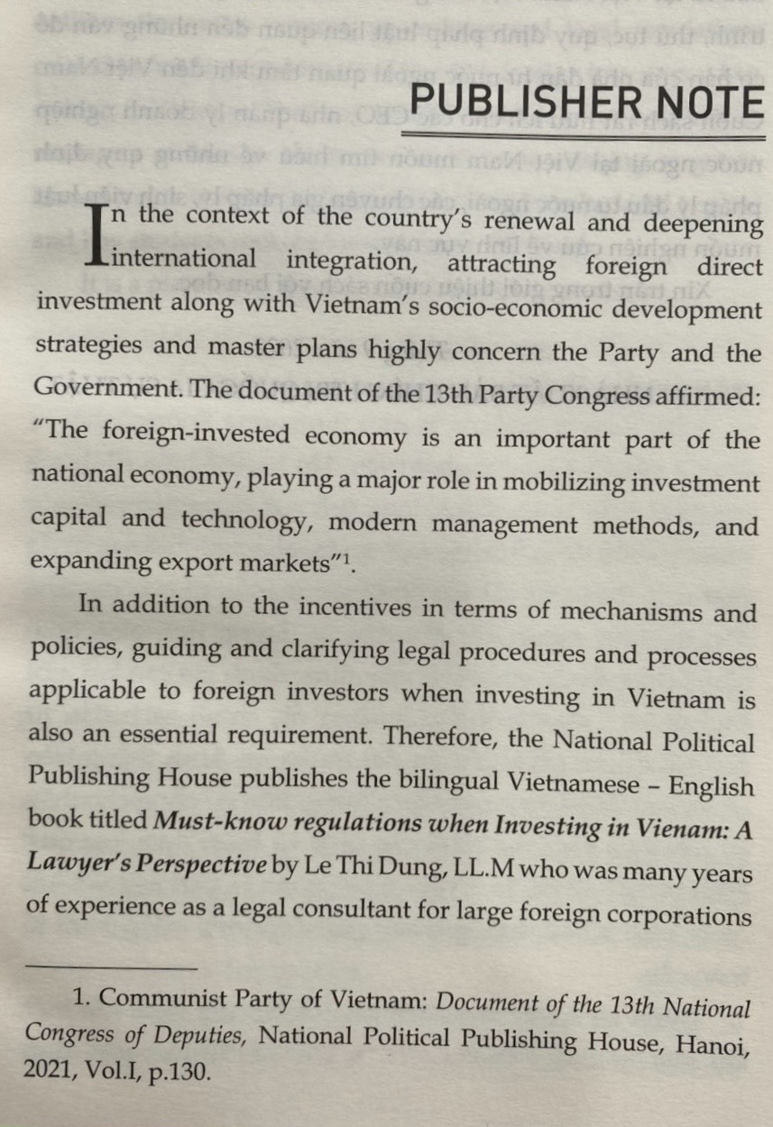 GÓC NHÌN LUẬT SƯ (song ngữ) Những quy định cần biết khi đầu tư vào Việt Nam ThS. Luật sư Lê Thị Dung Nxb Chính trị Quốc gia Sự thật Công ty phát hành: Nxb
