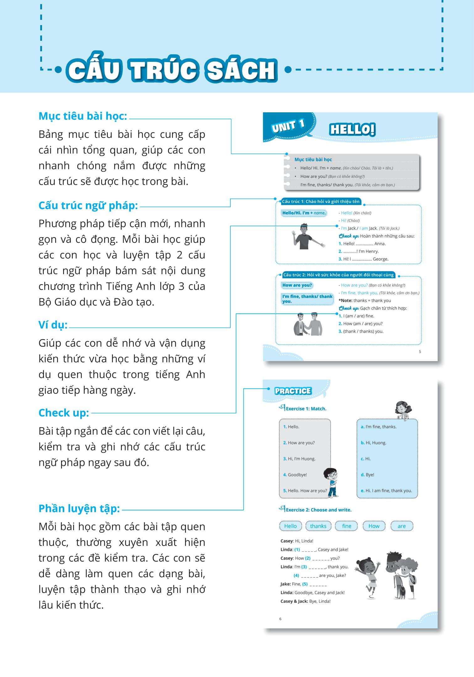 - Cấu trúc sách rất khoa học và logic, giúp các con dễ dàng bắt đầu và tiếp nhận bài học, từ đó học và ghi nhớ kiến thức hiệu quả hơn. Mỗi Unit sẽ được xây dựng với cấu trúc hoàn chỉnh như sau: Mục tiêu bài học → Cấu trúc ngữ pháp → Ví dụ minh họa → Check up (Bài tập ngắn) → Practice (Bài tập thực hành) → Review (Kiểm tra tổng hợp) → Key (Đáp án)