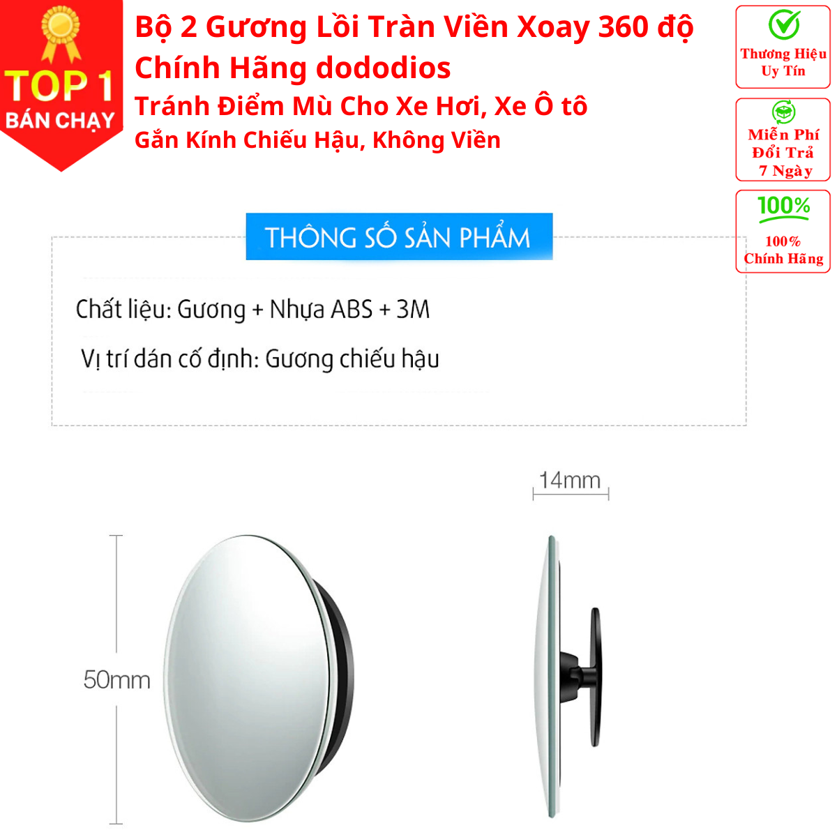 ✨gương cầu lồi cho xe ô tô, Bộ 2 Gương Cầu Lồi Tràn Viền Xoay 360 độ Gắn Cho Kính Gương Chiếu Hậu Tránh Điểm Mù Cho Xe Hơi, Xe Ô tô - Hàng Chính Hãng dododios