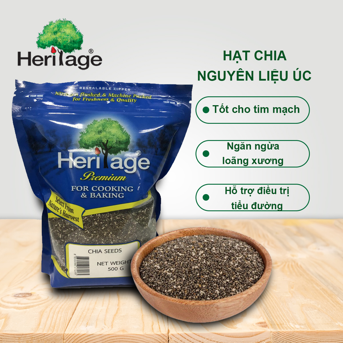 - Sản phẩm Hạt Chia HERITAGE của tập đoàn HERITAGE: hạt Chia được nhập khẩu nguyên liệu từ Úc ,nguyên liệu hoàn toàn tự nhiên, không tẩm ướp, không hóa chất, không sử dụng các chất phụ gia Hạt chia có tác dụng phòng chống bệnh tiểu đường. Hạt chia có nhiều Chất xơ . Hạt chia là nguồn bổ sung Axit béo Omega 3 Hạt chia chứa nhiều chất chống oxy hóa. Hạt chia tốt cho sức khỏe của xương và răng. Hạt chia cung cấp mangan. Hạt chia bổ sung phôt pho cho cơ thể. Hạt chia chứa nhiều protein.