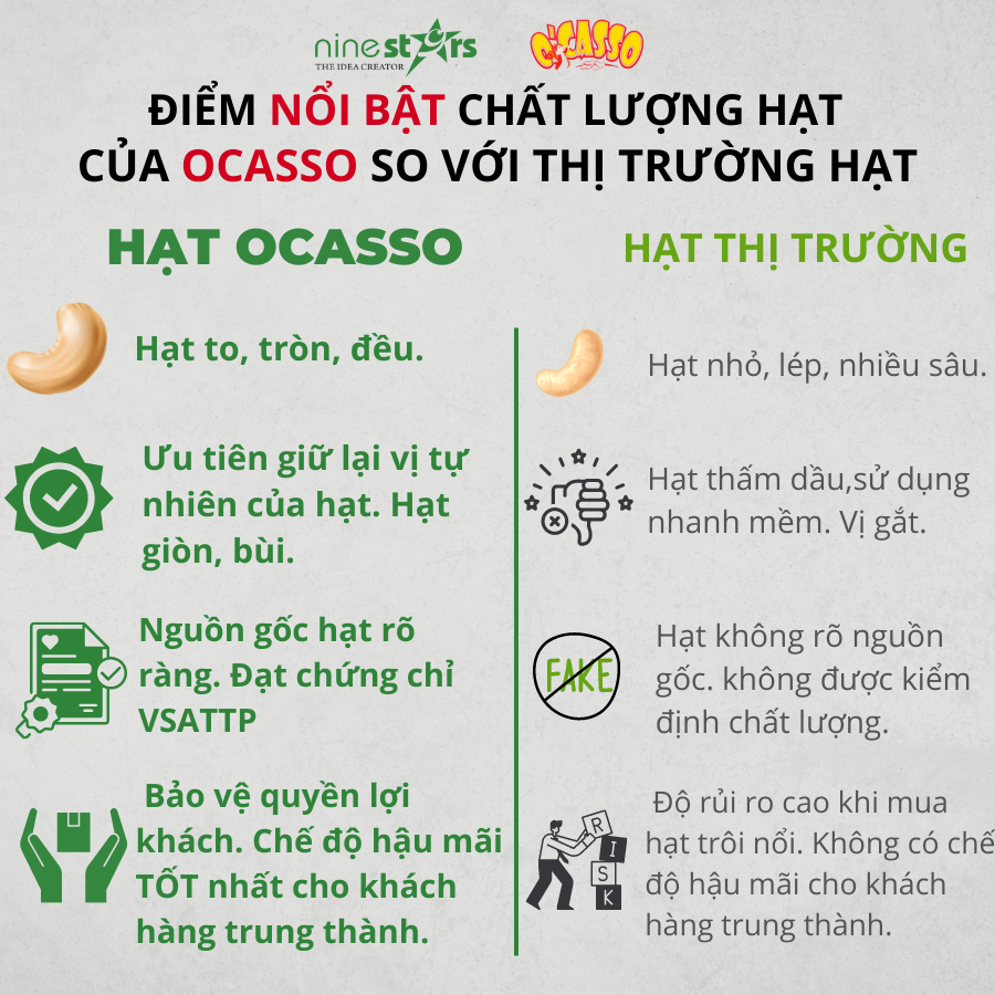 Hạt Điều Rang Muối  loại Cồ O’Casso   Hạt điều lụa rang muối loại cồ O’Casso là sản phẩm gần đây được nhiều người tiêu dùng ưa chuộng bởi thân hình to mẩy khiêu khích người dùng. Mỗi dịp lễ tết hay mua quà biếu tặng, ai ai cũng dễ dàng quyết định bởi sự quyến rũ của ngoại hình hạt điều to mẩy đẹp hút mắt với độ giòn tan béo bùi thơm ngon từng hạt.   Nine Stars đã nghiên cứu rất kỹ nguyên liệu hạt điều trước khi cho chế biến. Mỗi loại điều, giống điều hay vùng trồng cũng cho ra chất lượng hạt điều khác nhau, nên việc am hiểu nguyên liệu hạt điều là điều kiện rất cần thiết cho sản phẩm chế biến hạt điều nguyên. Sản phẩm hạt điều lụa rang muối loại cồ O’Casso có độ chắc hạt,  to mẩy, béo thơm, giòn tan, cực kỳ dễ bóc vỏ.   Thông tin sản phẩm Thành phần  : Hạt điều 90%, muối i-ốt 10% Hướng dẫn bảo quản: bảo quản nơi khô ráo, thoáng mát, tránh ánh nắng trực tiếp Hướng dẫn sử dụng : dùng ngay sau khi mở bao bì Giữ kín bao bì khi không sử dụng Hạn sử dụng 12 Tháng kể từ ngày sản xuất