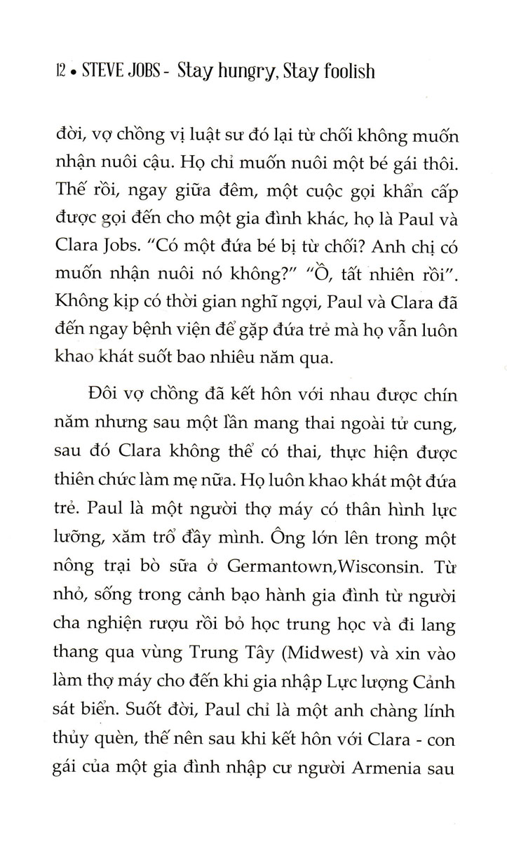 Hãy Cứ Khát Khao Hãy Cứ Dại Khờ (Sbooks) STAY HUNGRY, STAY FOOLISH - THẾ GIỚI NÀY KHÔNG VÌ BẠN LÙI BƯỚC MÀ SẼ TRỞ NÊN DỊU DÀNG VỚI BẠN HƠN, HAY CUỘC ĐỜI BẠN SẼ TRỞ NÊN TỐT ĐẸP HƠN. THẾ NÊN, HÃY CỨ KHÁT KHAO ĐI, KHÁT KHAO BẰNG TẤT CẢ NHỮNG GÌ BẠN CÓ. HÃY CỨ DẠI KHỜ ĐI, HÃY DẠI KHỜ TIN RẰNG KHÁT KHAO CỦA MÌNH NHẤT ĐỊNH SẼ TRỞ THÀNH HIỆN THỰC. Đây chắc chắn là nguồn cảm hứng tuyệt vời nhất bạn tìm thấy được từ cuộc đời của một thiên tài công nghệ Steve Jobs. Bên cạnh những nỗ lực ấn tượng liên quan đến sự ra đời của Apple, chắc chắn rất ít người biết Steve Jobs đã từng thực hiện một chiến dịch thương hiệu - một chiến dịch thể hiện rõ ràng tư duy, quan điểm, và thái độ của những người gia nhập vào ngành công nghệ. Steve Jobs từng nói: “Đó không phải vấn đề tốc độ xử lý hay bộ nhớ, nó nói về sự sáng tạo. Ở Apple chúng tôi đã quên mất mình là ai. Có một cách để nhớ bạn là ai, đó là nhớ ai là người hùng của bạn. Đây là cốt lõi của chiến dịch này”. Chiến dịch này không chỉ nhắm tới các khách hàng tiềm năng mà còn hướng tới các nhân viên của Apple. Họ đã dùng cụm từ “Tư duy khác biệt” và cũng như những người điên, “bởi chỉ những người đủ điên khùng để nghĩ họ có thể thay đổi thế giới chính là những người thay đổi thế giới”. Jobs phát biểu: Apple hướng tới những người có tư duy vượt khỏi khuôn khổ, những người muốn dùng máy tính để giúp họ thay đổi thế giới. Ngoài quảng cáo thương mại trên truyền hình, họ đã thực hiện một trong những chiến dịch quảng cáo in đáng nhớ nhất trong lịch sử. Họ cho in các tờ quảng cáo có hình các nhân vật lịch sử dễ nhận diện như Einstein, Lennon, Dylan, Picasso, Edison, Chaplin, King… với biểu tượng của Apple và dòng chữ “Tư duy khác biệt” ở góc. Điều gây tò mò ở quảng cáo này là họ in cả chân dung của những người không dễ nhận ra khiến người ta phải dừng lại và bàn tán nhau. Những người này thường có điểm chung là những người sáng tạo và chấp nhận rủi ro, không ngại thất bại và đánh cược cả sự nghiệp của mình để làm việc theo những cách khác biệt. Ý tưởng của việc quảng cáo này là động viên mọi người khẳng định chính họ như những cá thể độc lập, sáng tạo, đổi mới một cách táo bạo chỉ đơn giản bằng chiếc máy tính mà họ dùng. HÃY CỨ KHÁT KHAO, HÃY CỨ DẠI KHỜ chính là bức tranh toàn diện về cuộc đời cảm hứng của “Cha đẻ” Apple - Steve Jobs. Ở đây, bạn có thể tìm thấy những thông tin, những tuyên ngôn thuộc về Steve Jobs mà trước đây chưa ai đề cập với bạn.