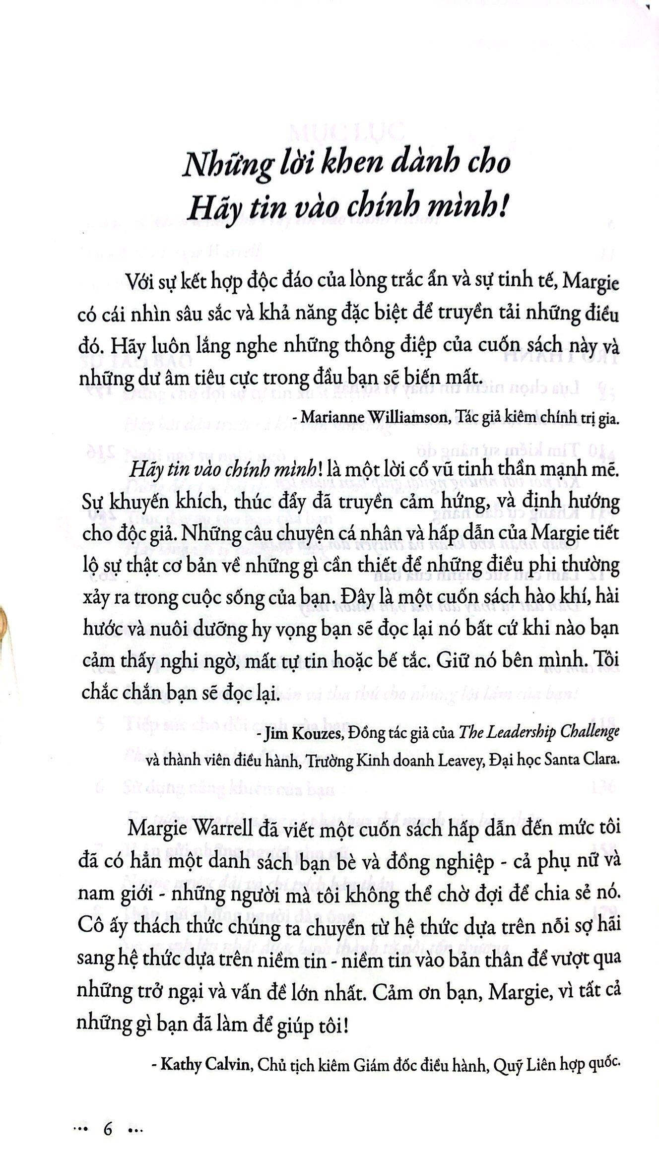 Những dòng chữ được viết bằng cả trái tim, cộng thêm những nghiên cứu khoa học vững chắc, Hãy tin vào chính mình! sẽ giúp bạn kết nối lại với sức mạnh bên trong, thúc đẩy khả năng tự phục hồi và tiếp thêm năng lượng cho lòng can đảm để bạn bay lên những tầm cao mới trong công việc, tình yêu và cuộc sống.