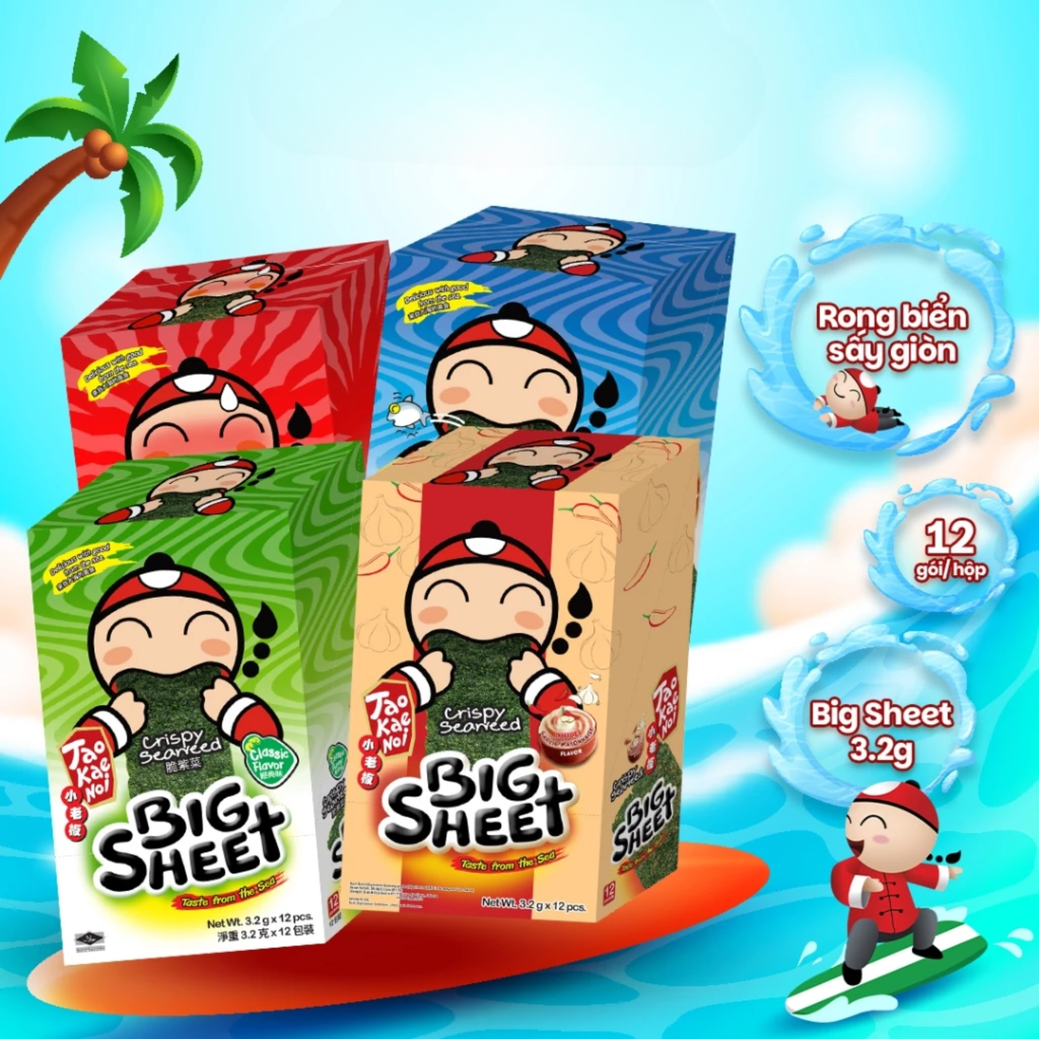 Snack Rong Biển Taokaenoi BIG SHEET nhiều vị: truyền thống, cay, hải sản, sốt Mayo tỏi ớt mới (Hộp 12 gói) Snack rong biển sấy BIG SHEET với nhiều hương vị thơm ngon, kèm thêm độ giòn xốp, khiến người dùng cả người lớn và trẻ em sẽ không thể cưỡng lại được sức hấp dẫn của món snack rong biển này khi đã ăn thử. Sản phẩm được sản xuất quy trình sấy hiện đại, vừa đem lại độ giòn xốp vừa bảo toàn được hương vị và phần lớn chất dinh dưỡng có trong rong biển. Mỗi gói 1 lá rong biển to, tiện lợi mang theo đi học, đi chơi.
