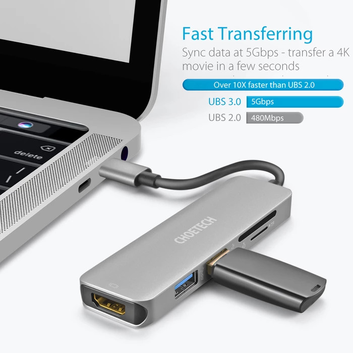 Với 1 chiếc Hub này, nó sẽ mở ra cho bạn 2 cổng kết nối USB 3.0 giúp bạn dễ dàng kết nối với các thiết bị ngoại vi như chuột, bàn phím, USB cho Macbook / laptop / PC một cách dễ dàng. Ngoài ra chiếc Hub này còn hỗ trợ một cổng HDMI độ phân giải 4K giúp trình chiếu video và cổng SD hỗ trợ đọc thẻ nhớ.