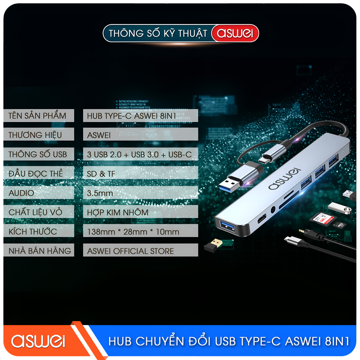 ✨Hub Chuyển Đổi USB Type C ASWEI 8 in 1 - USB 3.0, SD, TF, USB C, Audio 3.5 Tốc Độ Cao - Hàng Chính Hãng