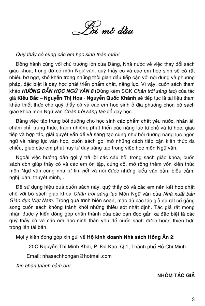 Đồng hành cùng với chủ trương lớn của Đảng, Nhà nước về việc thay đổi sách giáo khoa, trong đó có môn Ngữ văn, quý thầy cô và các em học sinh sẽ có rất nhiều bỡ ngỡ, khó khăn trong những thời gian đầu tiếp cận với nội dung và phương pháp, đặc biệt là dạy học phát triển phẩm chất, năng lực. Vì vậy, cuốn sách tham khảo HƯỚNG DẪN HỌC NGỮ VĂN 8 (Dùng kèm SGK Chân trời sáng tạo) của tác giả Kiều Bắc – Nguyễn Thị Hoa - Nguyễn Quốc Khánh sẽ tiếp tục là tài liệu tham khảo thiết thực cho quý thầy cô và các em học sinh ở địa phương chọn bộ sách giáo khoa môn Ngữ văn Chân trời sáng tạo để dạy học.