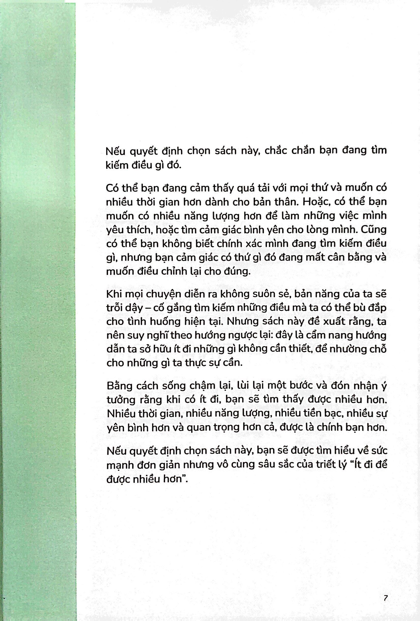 - Oscar Wilde Tất cả chúng ta đều có lúc lạc lối giữa cuộc sống bận rộn và hối hả, nhưng bạn luôn có thể khám phá ra con đường trở về với bản thân tốt đẹp và hạnh phúc nhất. Tất cả những gì bạn cần là sống chậm hơn, có chủ đích hơn và đón nhận triết lý “ít đi để được nhiều hơn”. Với nhiều lời khuyên thiết thực cùng những hình ảnh minh họa sinh động, Ít Đi Để Được Nhiều Hơn sẽ giới thiệu đến bạn những phương pháp sống tối giản để giảm bớt sự lộn xộn trong cuộc sống, sắp xếp lịch trình hiệu quả và dành thời gian cho những điều thực sự quan trọng, cũng như làm cho cuộc sống hàng ngày của bạn trở nên phong phú hơn bằng cách xem trọng chất lượng hơn số lượng.