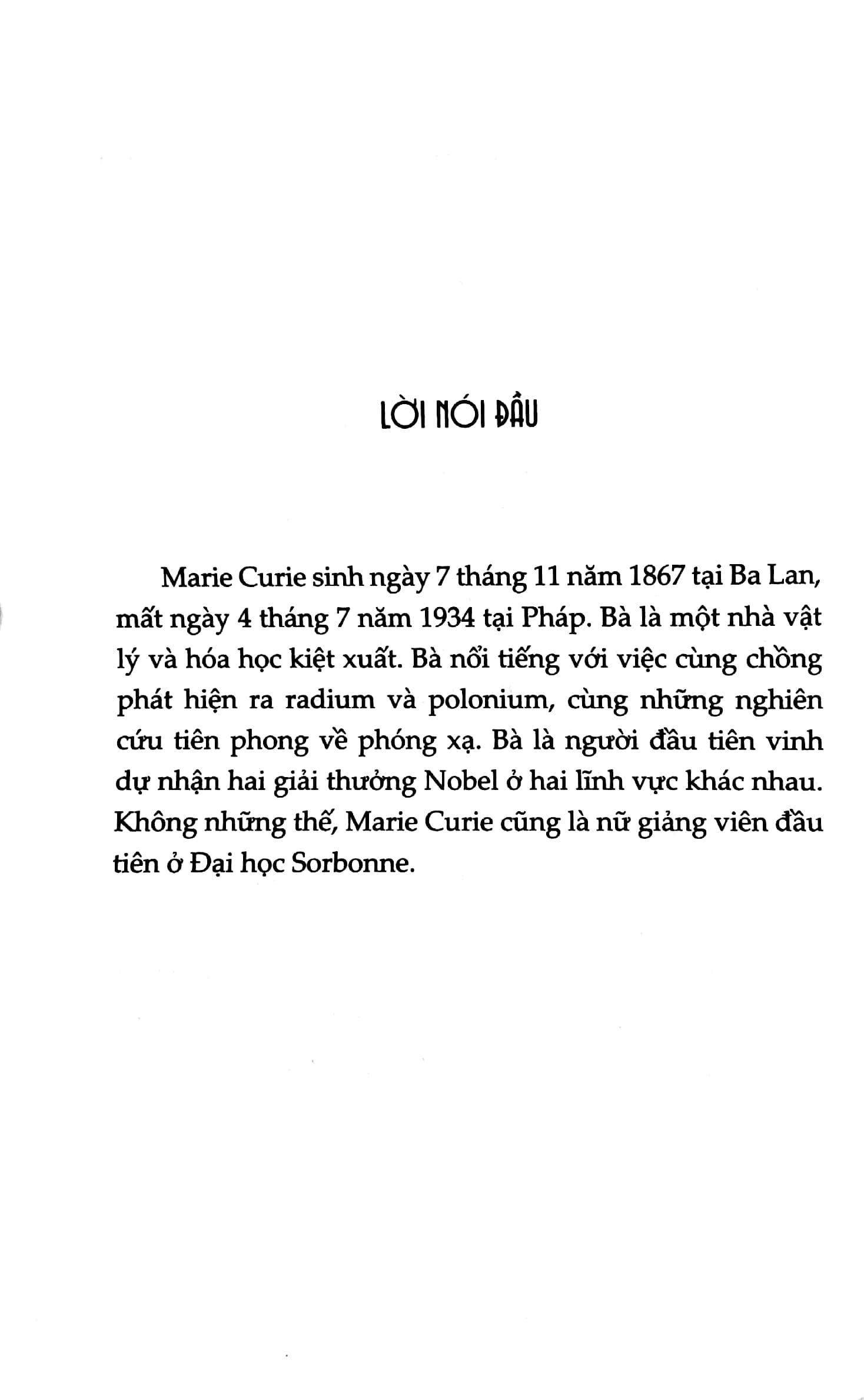 Cuốn sách gồm những câu chuyện viết về cuộc đời của nhà nữ khoa học kiệt xuất: Marie Curie. Ngay từ nhỏ, bà đã bộc lộ tư chất thông minh hơn người và lòng say mê khoa học. Năm 24 tuổi, Marie học tại trường Đại học Sorbone danh tiếng ở Paris và là một trong những sinh viên xuất sắc nhất của trường. Cũng tại Pháp, Marie Curie đã gặp và kết hôn với nhà vật lý danh tiếng người Pháp - Pierre Curie. Có chung niềm đam mê khoa học, hai vợ chồng làm việc gần như làm việc không ngừng nghỉ. Sau một loạt các nghiên cứu, thí nghiệm, cuối cùng họ đã phát hiện ra hai nguyên tố hóa học mới: polonium và radium. Với những đóng góp to lớn của mình, bà đã được trao giải Nobel Vật lý cùng chồng và Henri Becquerel năm 1903 và giải Nobel Hóa học năm 1911.