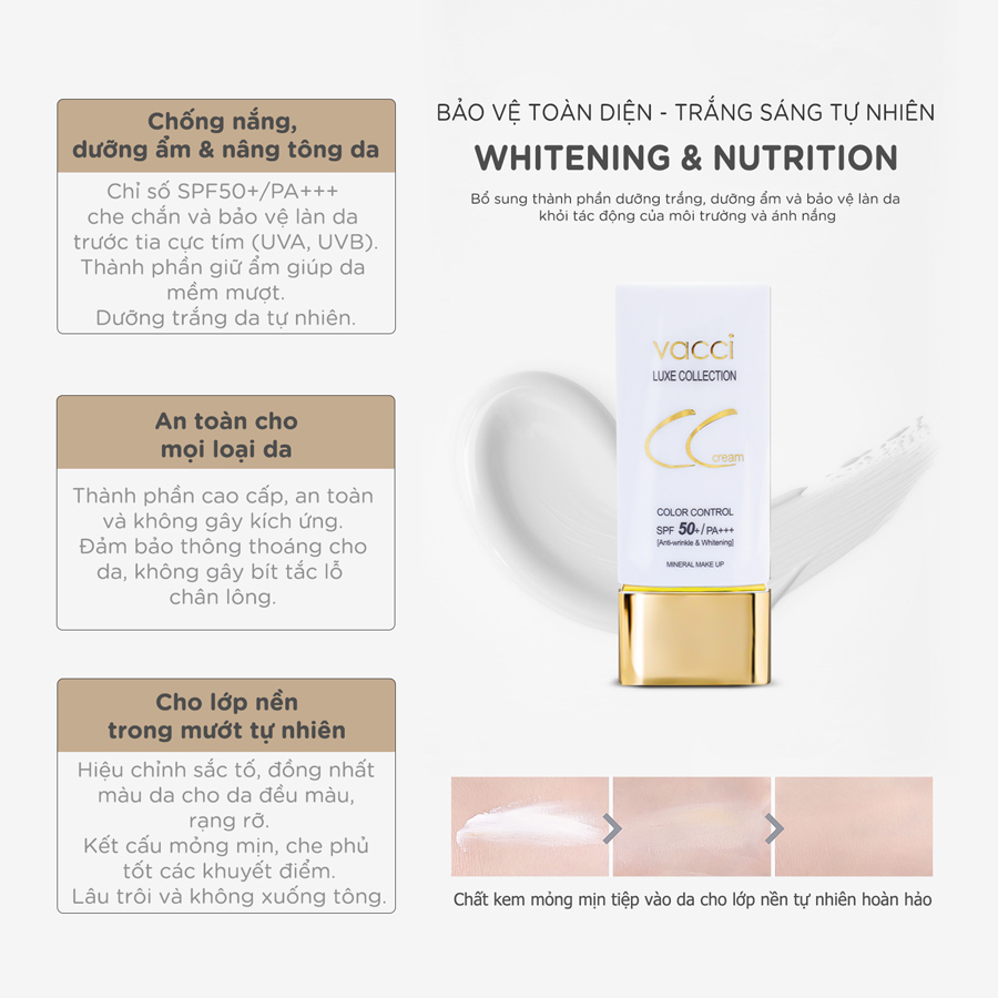 Tên viết tắt của CC là cụm từ “color correction” hay “color control” nghĩa là “CC VACCI cream điều chỉnh màu da”, do đó sản phẩm này tập trung vào việc cải thiện sự đồng đều màu da. Kem Phấn Nền Thế Hệ Mới Dưỡng Trắng Da Đa Chức Năng CC VACCI Cream SPF50+/PA+++ là sản phẩm kem trang điểm đa năng có tác dụng hiệu chỉnh tông màu da, cho làn da đều màu tự nhiên. Chứa những hạt phân tử siêu nhỏ được chiết xuất từ thiên nhiên, có khả năng giúp bảo vệ da khỏi tác nhân bên ngoài, ngăn khói bụi ô nhiễm từ bên ngoài tác động vào da mà không gây kích ứng.