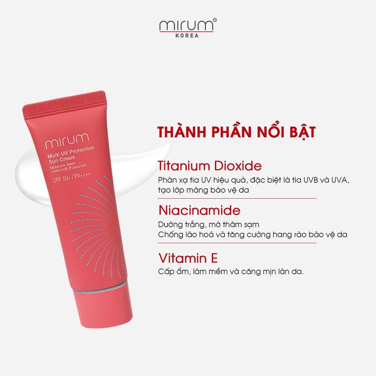Kem chống nắng nâng tông, dưỡng trắng, ngừa lão hóa và bảo vệ da toàn diện Mirum 50ml – Mirum Multi UV Protection Sun Cream SPF 50+/PA+++ THÔNG TIN SẢN PHẨM Kem chống nắng nâng tông, dưỡng trắng, ngừa lão hoá và bảo vệ da toàn diện Mirum 50ml