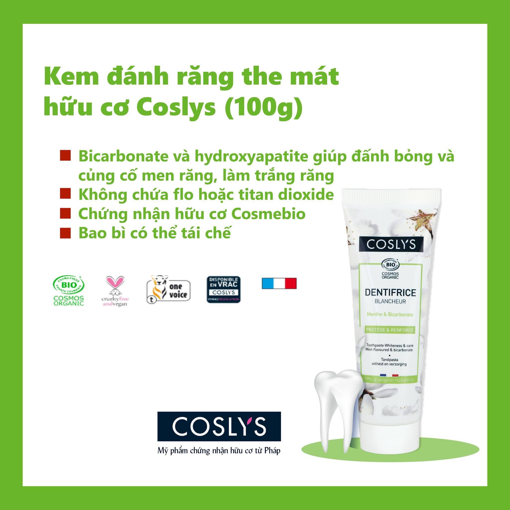 Chứng nhận hữu cơ Ecocert Chứng nhận Hữu cơ bởi Cosmos Organic ️Thương hiệu: Coslys - Pháp Kem đánh răng hữu cơ làm trắng răng hương hoa Coslys với mùi hương hoa cỏ ngọt, thành phần được làm giàu với bicarbonate và lô hội sẽ nhẹ nhàng đánh bóng răng, đồng thời củng cố men răng.
