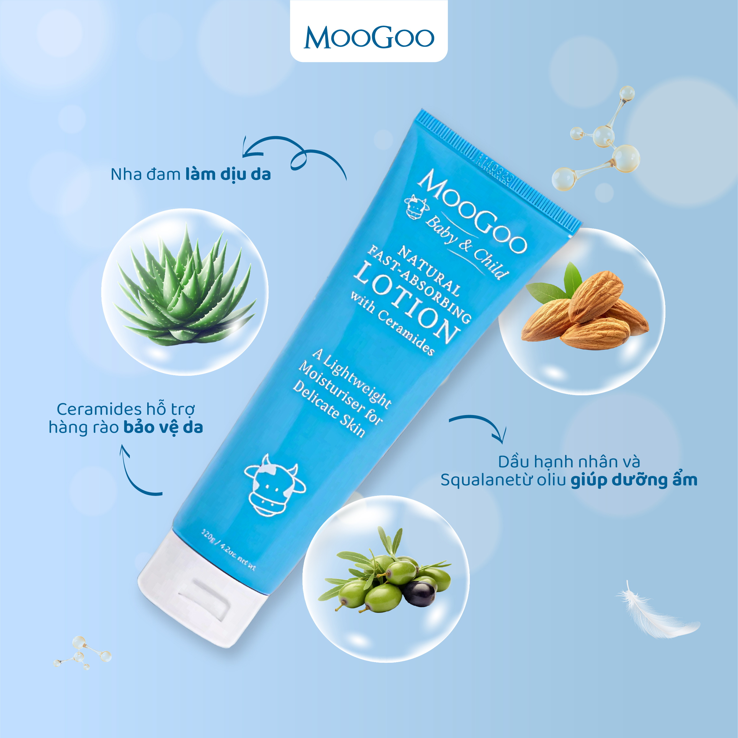 Sản phẩm được làm từ hai loại dầu tự nhiên yêu thích của MooGoo là Sweet Almond và Olive Squalane, cùng với các cứu tinh làm dịu da như Lô hội và Mật ong.