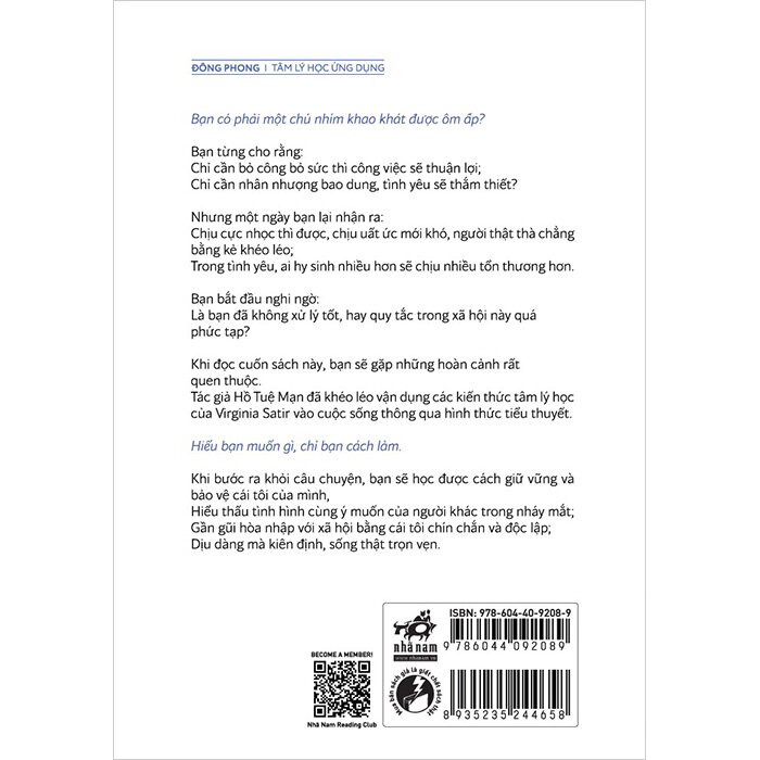 Tác giả Hồ Tuệ Mạn đã khéo léo vận dụng các kiến thức tâm lý học của Virginia Satir vào cuộc sống thông qua hình thức tiểu thuyết,
