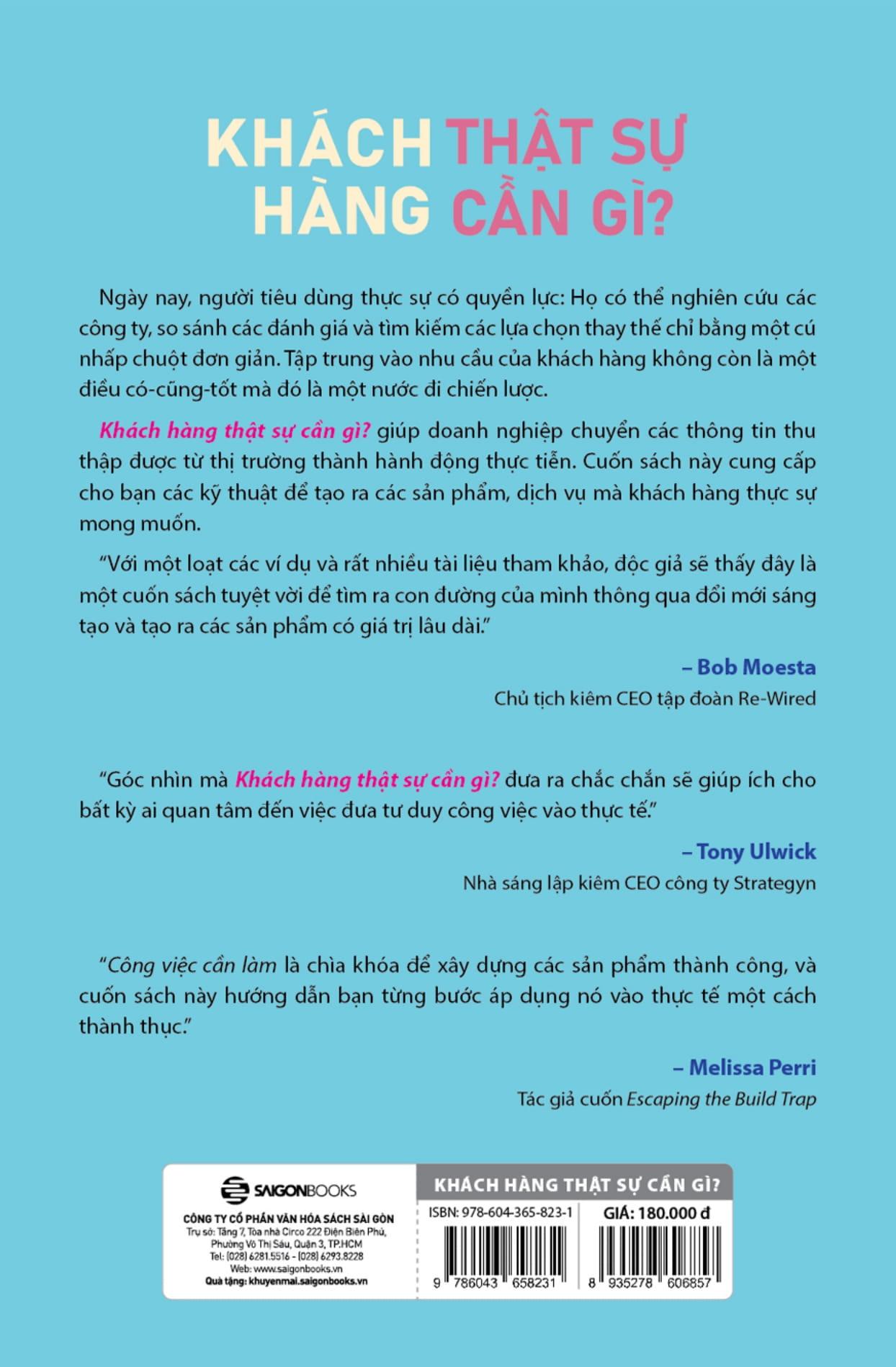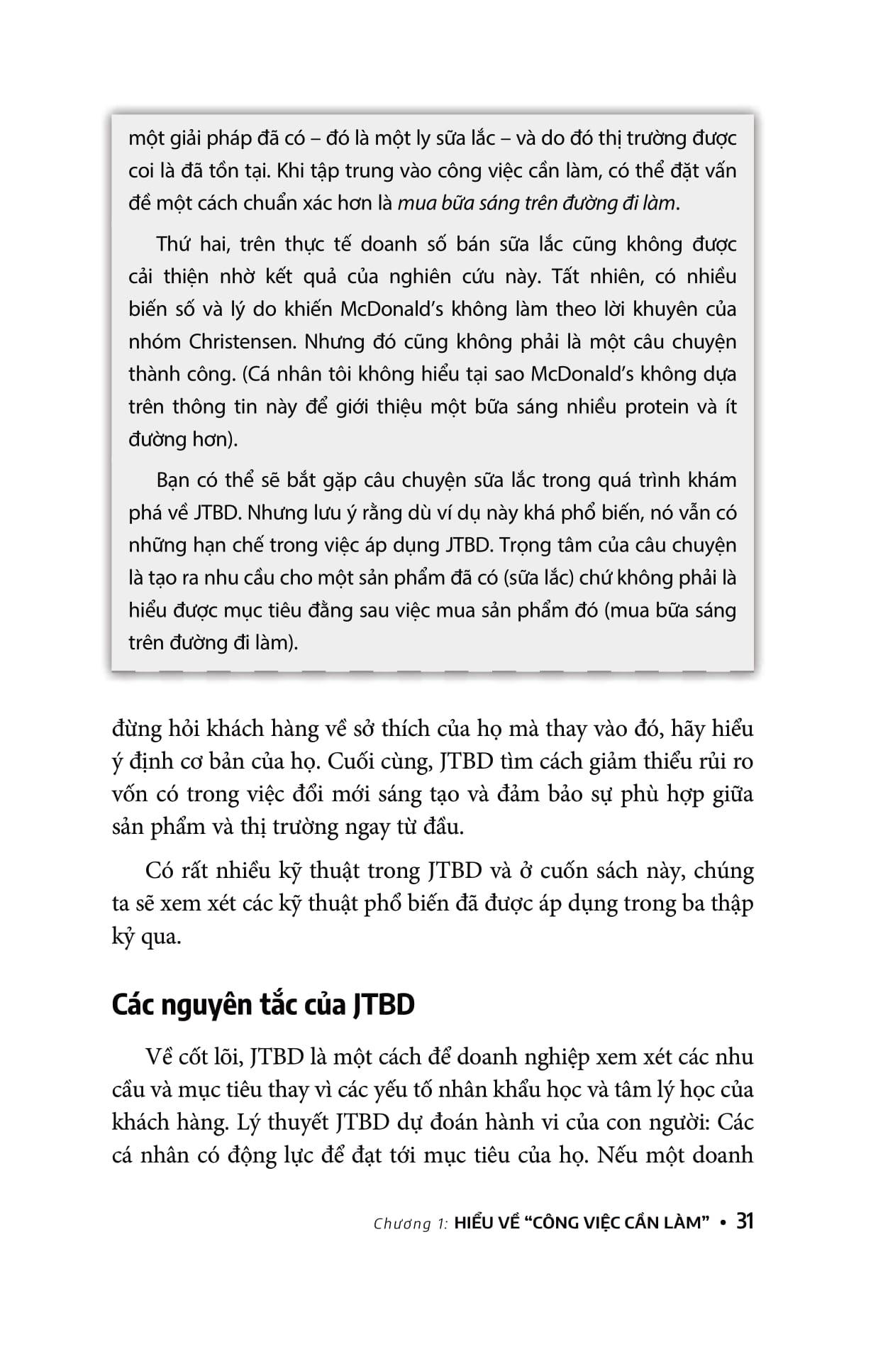 KHÁCH HÀNG THẬT SỰ CẦN GÌ? Giải quyết vấn đề theo tư duy công việc cần làm Tất tần tật về khái niệm Jobs to Be Done (JTBD) Đây là cuốn sách nhập môn hướng dẫn cho bạn về “Job to Be done” (hay JTBD), một lý thuyết đã được nghiên cứu gần 30 năm. Cuốn sách tập hợp các phương pháp đang được thực hành hiện nay mà tác giả Jim Kalbach gọi là “các chiến thuật”, mượn cách nói ẩn dụ “sổ tay chiến thuật” trong thể thao. Về cơ bản, chiến thuật là các kỹ thuật riêng lẻ tạo nền tảng để thực hiện JTBD. Mục đích của cuốn sách The Jobs to Be Done Playbook: Align Your Markets, Organization, and Strategy Around Customer Needs là cung cấp cho bạn một bản tham chiếu về các phương pháp tiếp cận khác nhau trong JTBD trên thực tế. Nhưng hãy nhớ rằng các phương pháp được trình bày trong cuốn sách này vẫn chưa phải là tất cả. Các tài liệu này được đưa ra dựa trên nghiên cứu của tác giả Jim Kalbach về JTBD và cách ông áp dụng các kỹ thuật trong JTBD cho công việc suốt 10 năm qua. Khi viết cuốn sách này, tác giả Jim Kalbach cũng có nhận thức sâu sắc về những thiếu sót của JTBD. Giống như bất kỳ phương pháp nào khác, JTBD không phải giải pháp cho mọi vấn đề mà sẽ có sự đánh đổi khi thực hành chúng. Khi bạn đọc cuốn sách này với tư duy phản biện, bạn nên lưu tâm những lợi ích sau đây của JTBD. ■ Thứ nhất, JTBD tập trung vào một đơn vị phân tích – đó là “công việc”. Sau đó, các nhu cầu, cảm xúc và nguyện vọng của khách hàng sẽ được nhìn nhận trong mối quan hệ với “công việc”, dựa trên sự hiểu biết về công việc chính. ■ Thứ hai, vì JTBD không bắt nguồn từ một chuyên ngành cụ thể, chẳng hạn như thiết kế hay marketing, nên các đội nhóm khác có thể dễ dàng áp dụng cách tiếp cận này để thấu hiểu khách hàng theo cách của họ. ■ Thứ ba, bởi vì JTBD xem mục tiêu của một cá nhân là độc lập với công nghệ nên phương pháp này chứng minh suy nghĩ của bạn sẽ thành hiện thực như thế nào trong tương lai. Việc định nghĩa công việc càng đại chúng càng có thể giúp bạn tạo ra các giải pháp tốt hơn cho khách hàng trong tương lai mà không bị ràng buộc với quá khứ. Bạn có thể cảm thấy không thoải mái khi mới áp dụng JTBD và cần thời gian để thực hành. “Khách Hàng Thật Sự Cần Gì?” được sắp xếp thế nào? “Việc cốt lõi mà bất kỳ doanh nghiệp nào cũng cố gắng hoàn thành là gì?”. Peter Drucker gợi cho chúng ta một câu trả lời rất hay: “Chỉ có một định nghĩa duy nhất cho mục đích kinh doanh: tạo ra khách hàng. Doanh nghiệp tồn tại để tạo ra giá trị – giá trị cho khách hàng được thể hiện qua việc doanh nghiệp thỏa mãn nhu cầu của họ (đổi mới sáng tạo) và giá trị cho doanh nghiệp được thể hiện bằng cách duy trì lợi nhuận (tiếp cận thị trường). Từ góc độ này, tác giả đã sắp xếp các kỹ thuật hay chiến thuật trong “Khách Hàng Thật Sự Cần Gì?” theo 5 giai đoạn cung cấp các giải pháp mà khách hàng thấy có giá trị: Khám phá giá trị: Tìm đúng vấn đề cần giải quyết cho khách hàng. Định nghĩa giá trị: Thiết lập hướng giải quyết vấn đề đã xác định được. Thiết kế giá trị: Tạo ra các giải pháp được mong đợi, có tính khả thi và hữu ích. Cung cấp giá trị: Đưa giải pháp ra thị trường theo một mô hình kinh doanh thành công. (Tái) phát triển giá trị: Tiếp tục đổi mới sáng tạo và phát triển doanh nghiệp.