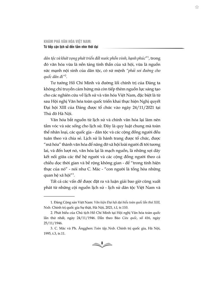 Cuốn sách “Khám phá văn hóa Việt Nam: Từ tiếp cận lịch sử đến tầm nhìn thời đại” gồm 17 chuyên luận, được chia thành các nhóm vấn đề cơ bản trong lịch sử văn hóa Việt Nam, gợi mở những hướng nghiên cứu mới, góp phần giữ gìn, phát huy những giá trị văn hóa tốt đẹp của dân tộc. Trân trọng giới thiệu cuốn sách tới bạn đọc!