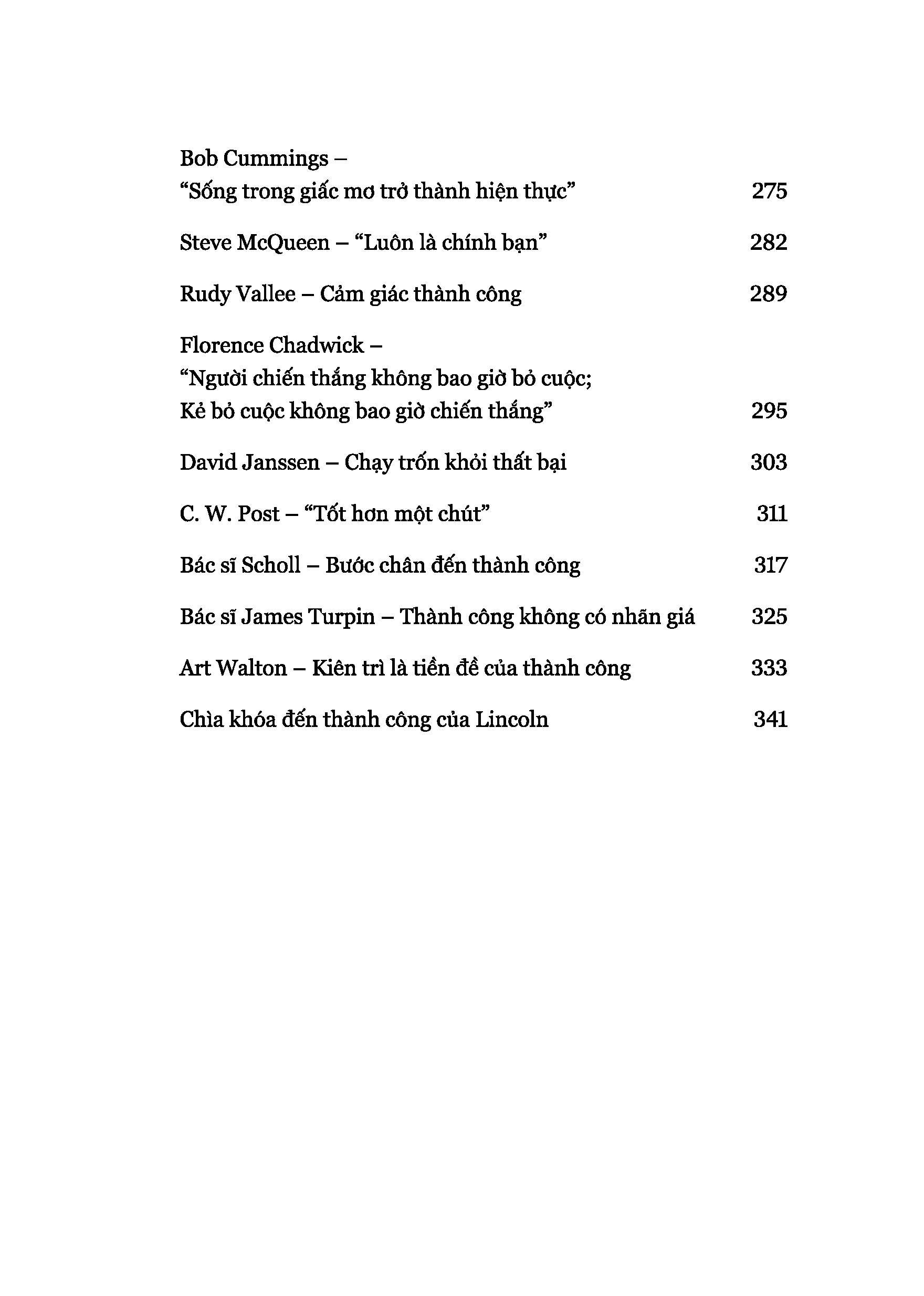 Trong cuốn sách, bạn có thể bắt gặp câu chuyện thành công của W. Clement Stone – người khởi đầu là một cậu bé bán báo trên đường phố, sau đó tích lũy kinh nghiệm và chia sẻ với người khác khối tài sản trị giá hơn 160 triệu đô la; hay câu chuyện về nhà soạn nhạc George Handel từng bị cả xã hội thượng lưu quay lưng, nhưng sau đó đã vượt lên mọi cơn bão để trở thành nhà soạn nhạc được cả thế giới kính trọng;…