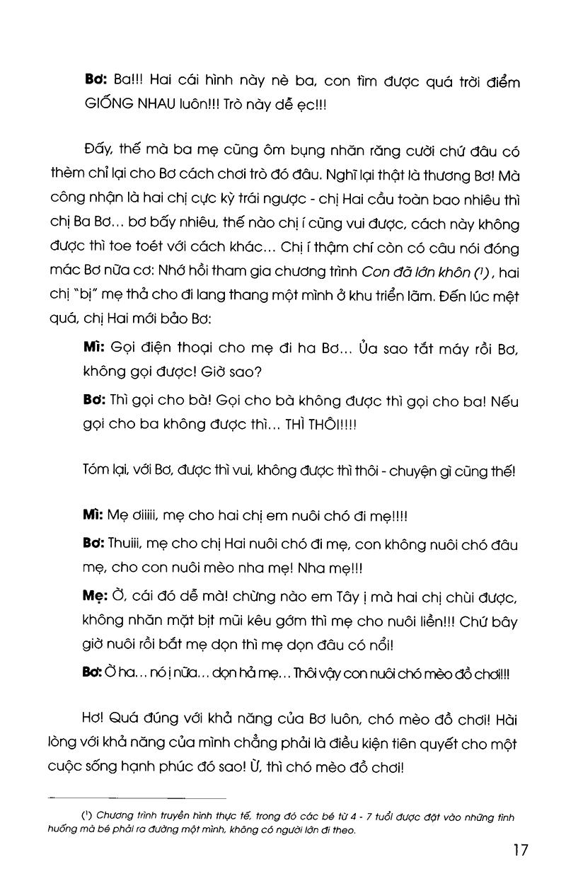 Không Được Thìôi (Tập 1) Đi học về Bơ: Hôm nay con để quên thước kẻ ở nhà mẹ ạên quá trời! Mẹ: Trời!!! Quên thước ở nhà, không có thước dùng mà hên là sao???? Bơ: Hên chứ mẹ! Quên thước thì con ráng kẻ bằng tay từ từ nó cũng thẳng, chứ lỡ mà con quên viết chì, không có viết viết mới xui!!!