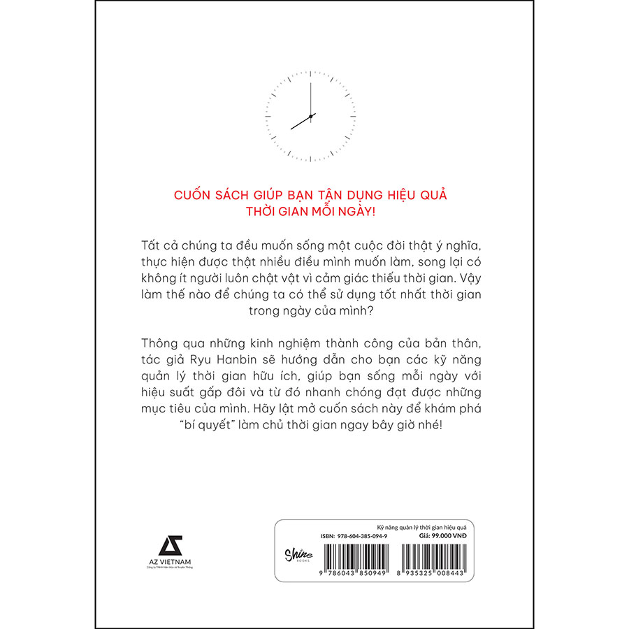 Thông qua những kinh nghiệm thành công của bản thân, tác giả Ryu Hanbin sẽ hướng dẫn cho bạn các kỹ năng quản lý thời gian hữu ích, giúp bạn sống mỗi ngày với hiệu suất gấp đôi và từ đó nhanh chóng đạt được những mục tiêu của mình. Hãy lật mở cuốn sách này để khám phá “bí quyết” làm chủ thời gian ngay bây giờ nhé!